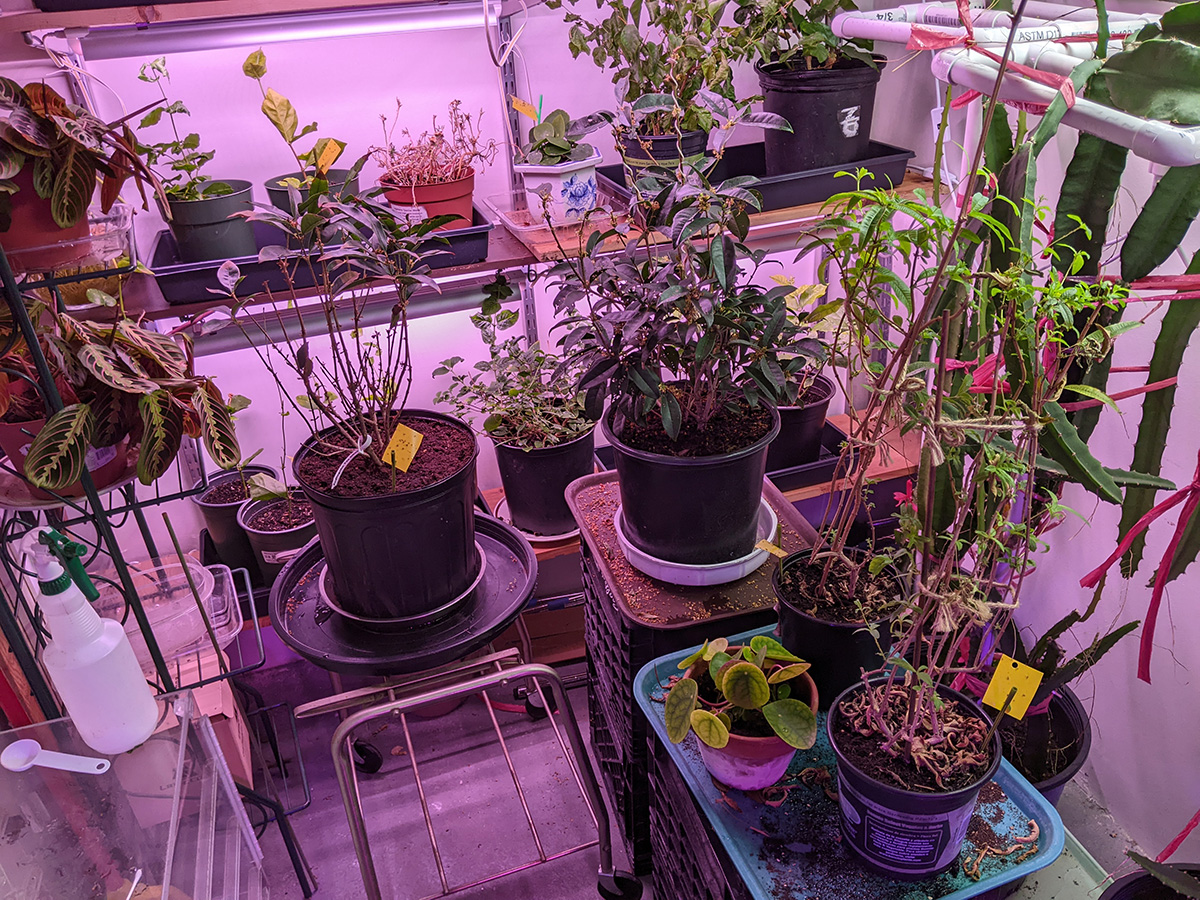 after finishing up with outside work, i was in the basement around 3:30pm, watering the plants. i also took a few outside (those that i found with mealy bugs) so i can spray them with neem oil. i pruned off any new cactus growth, as we want them to conserve their energy for when we move them outside.