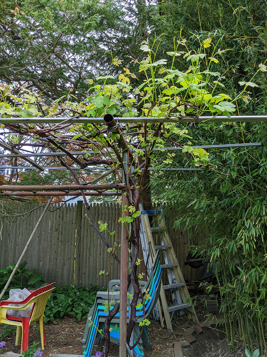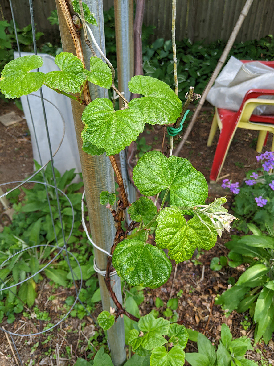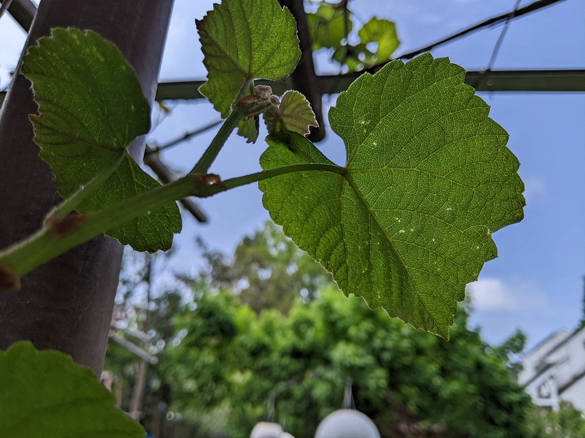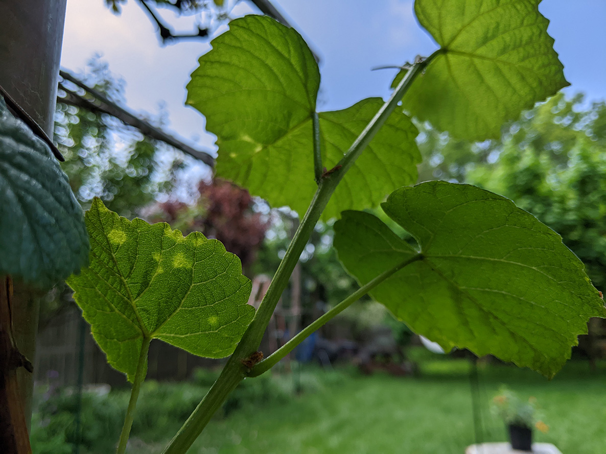 the sun also came out and typically i prefer spraying on cloudy days so the chemicals don't sun-scald the leaves, but i didn't have much choice. i mixed 1.2 tbsp (18ml) of immunox liquid with 0.75 tbsp (2.25 tsp) of captan powder to half a gallon of water. while i was spraying, i did notice some leaf spots on the reliant grapevine that looked like it might be fungal disease. it's only been 2 weeks since my last spray, and the concord grapes barely had buds; now they're new vine shots 1-2 ft in length.