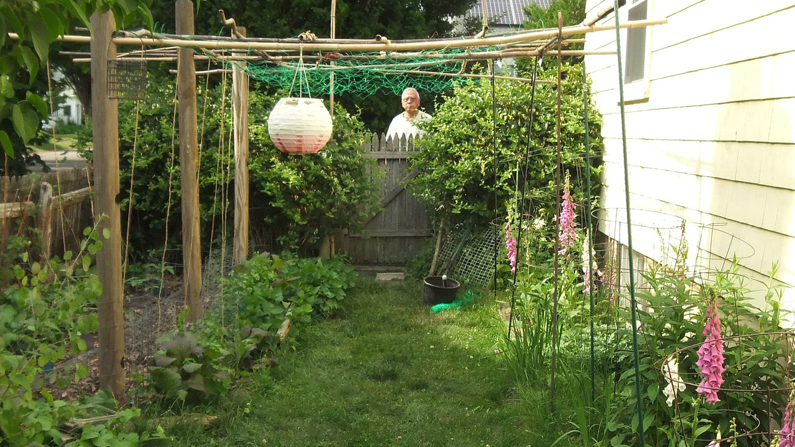 my father also set up the trellis on the western side of the house, putting a layer of my cheap plastic green netting for additional support, and also running twine to the climbing bitter melons and squashes. we even saw 2 new emerging squash seedlings, hopefully chipmunks don't dig them up like they did in RB2. speaking of which, i put out the live animal trap near the faucet, hoping to catch a chipmunk and then release it elsewhere. however, i didn't put any bait, i'll have to add something tomorrow.