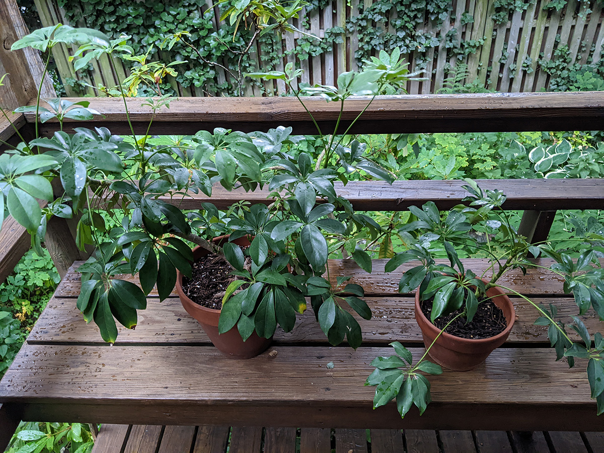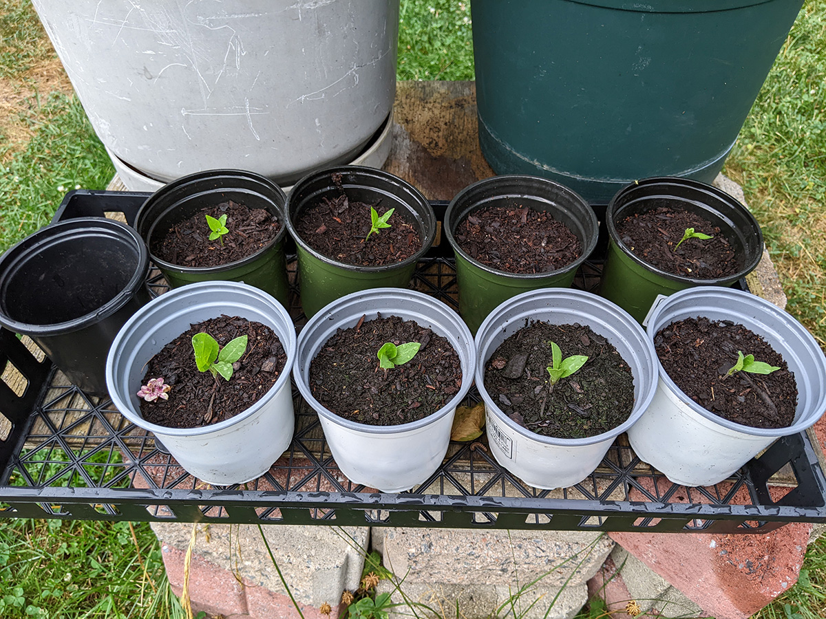 like i mentioned earlier, the rain barrel gauge hardly moved, we didn't collect any significant amount of rain. one of the new gardenia flower buds dropped off, the one with the yellow stem we noticed yesterday; the other flower bud seems to be okay for the time being. the home depot osmanthus is starting to form some flowers, which is unusual since i thought they didn't flower until the fall-winter seasons. a lot of our pruned potted plants are beginning to grow new leaves: the lemon verbana i noticed yesterday, but had we known we would've pruned earlier; the gardenia; and the jasmine. also all those plants absolutely thrive in the heat (as long as they get watered daily) and sunlight.