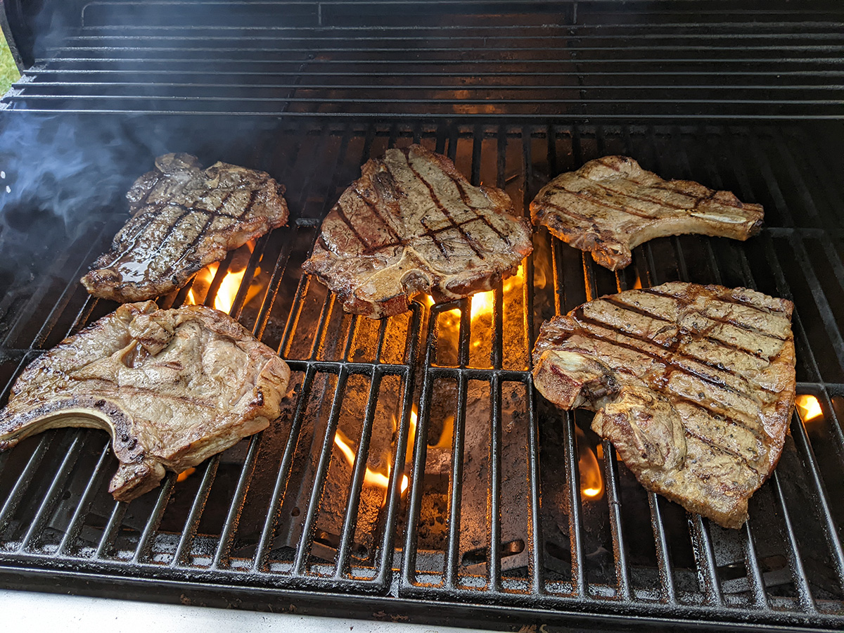 the rain finally stopped about 5:30pm, which allowed us to go outside and grill the 3 pieces of porterhouse steaks and 2 porkchops. we preheated the barbecue up to 550 degrees before adding the meats. earlier we'd taken out the steaks and i'd seasoned them with salt and pepper. my father also brushed some butter on the steaks before grilling, to additional flavor and to prevent them from sticking. we decided on 3 minutes per side for medium-rare, but added another minute to each side when it looked like they were completely done yet. that turned out to be a mistake, as the steaks came out medium doneness. next time, stick to the 3-minutes-per-side rule, and let the meat continue to cook in its own juices.