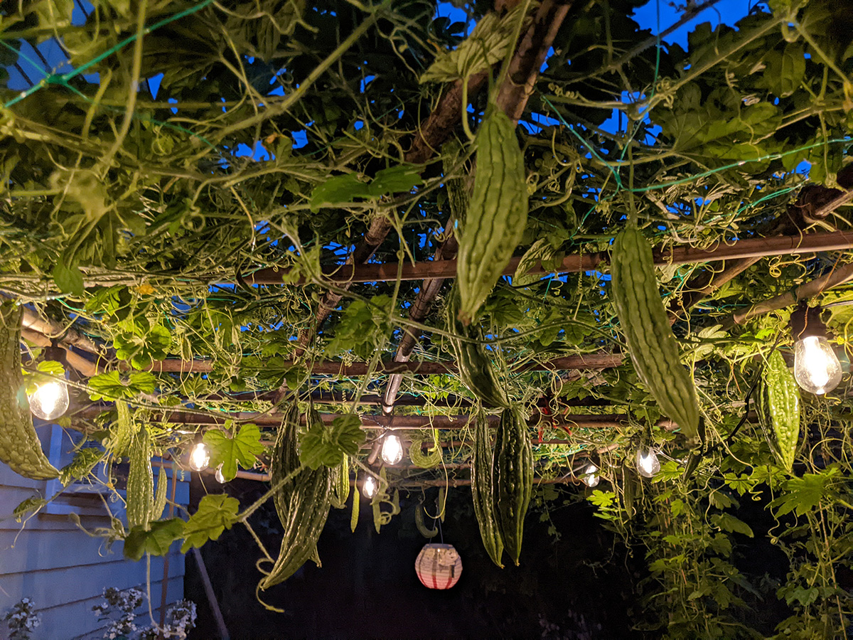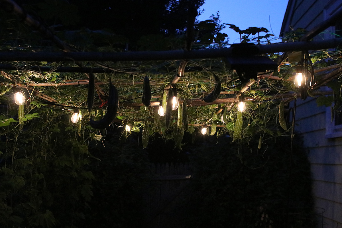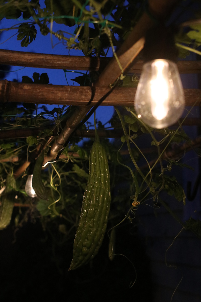 because i was chromecasting slow horse from my computer, my mother wouldn't let me leave until she finished all 6 episodes, which finally ended at 8pm. in the meantime i had a chance to go outside and take photos of the hanging bitter melons on the trellis illuminated by our led edison light bulbs.