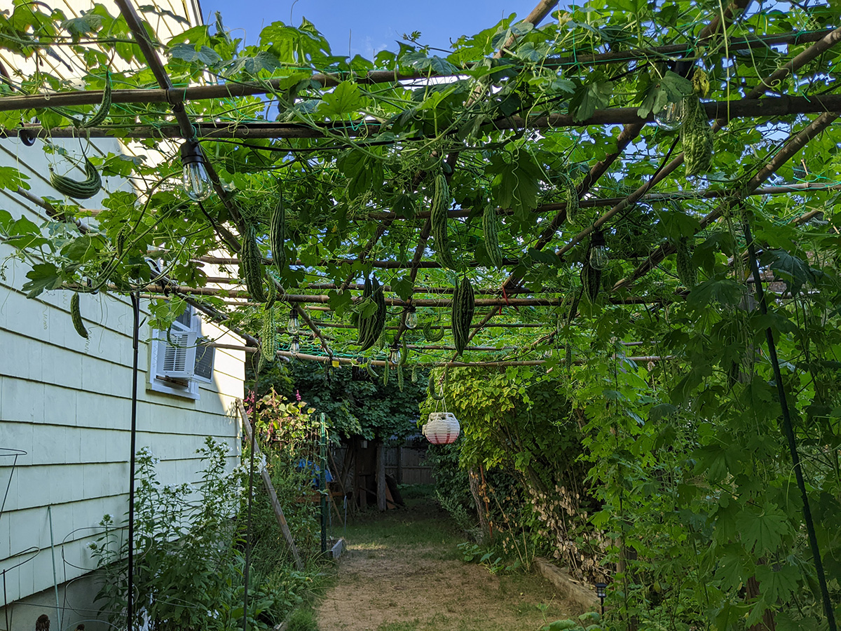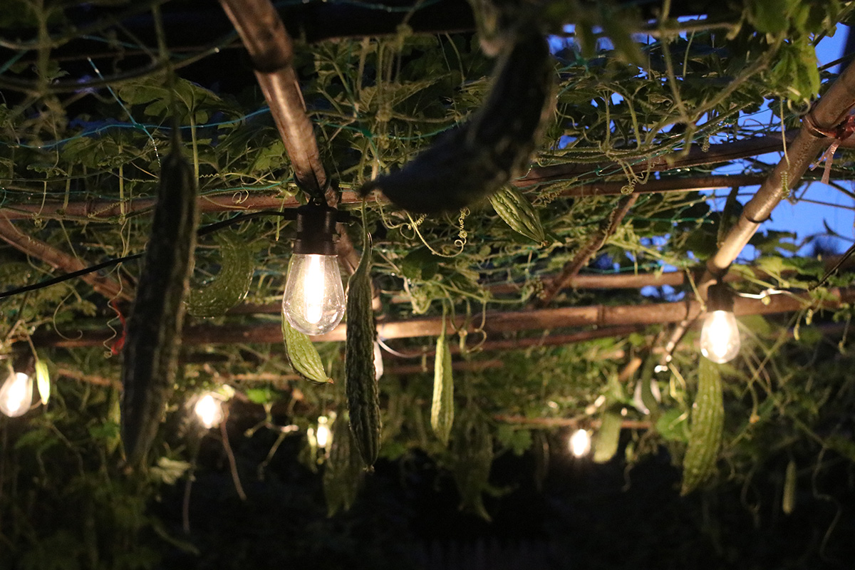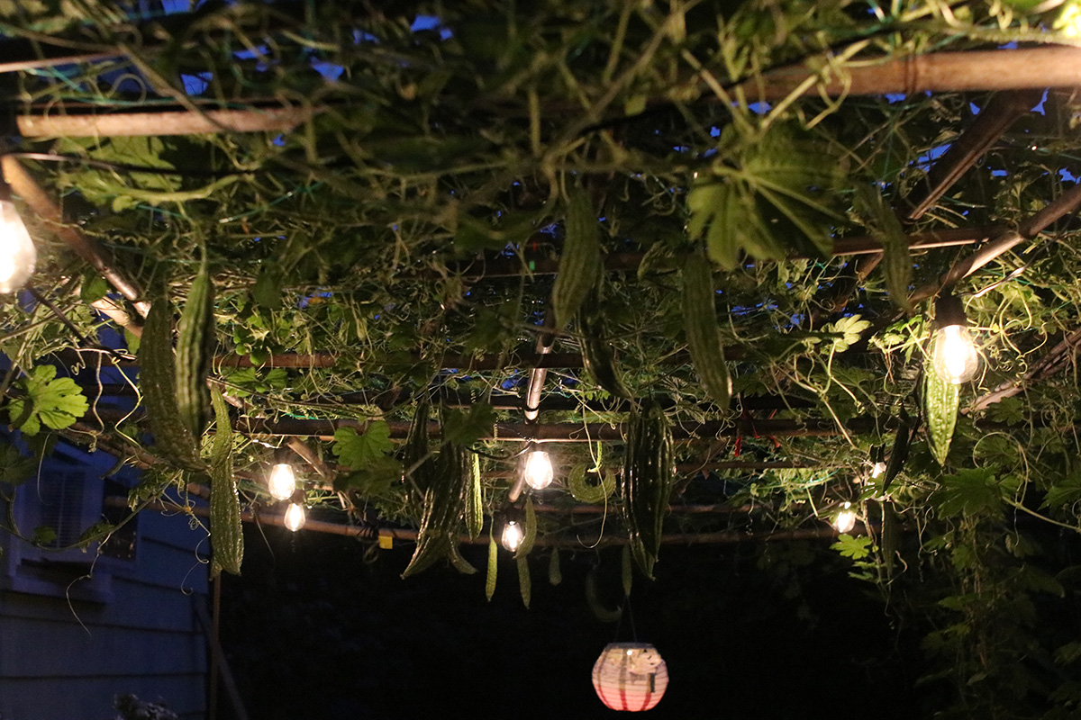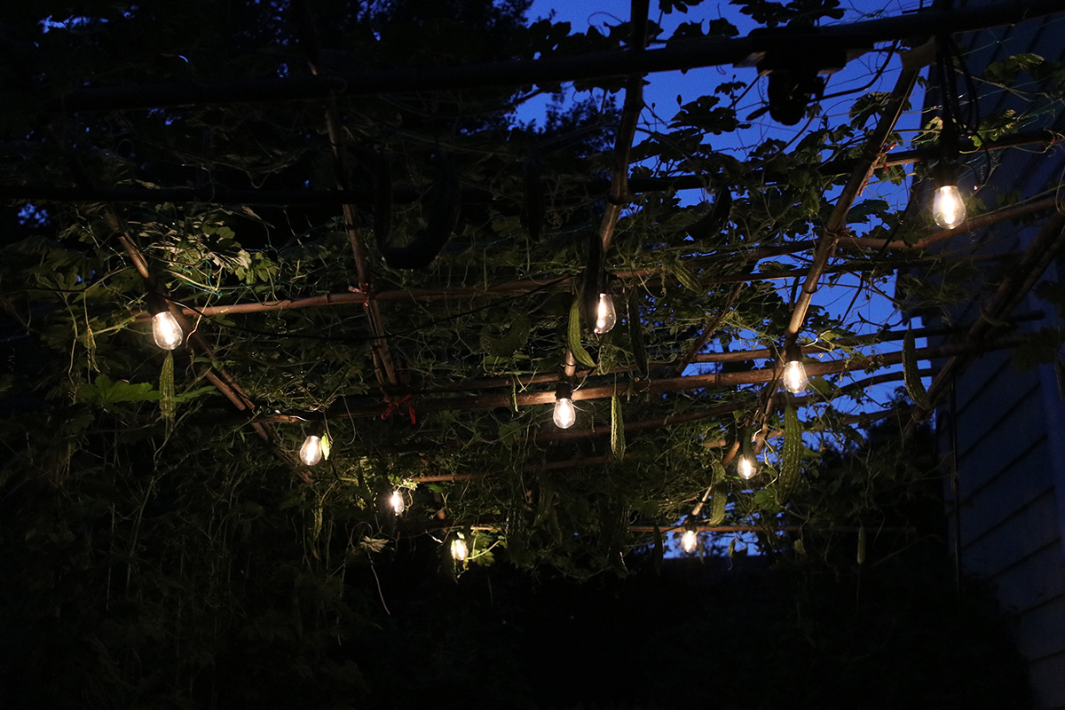 because i was chromecasting slow horse from my computer, my mother wouldn't let me leave until she finished all 6 episodes, which finally ended at 8pm. in the meantime i had a chance to go outside and take photos of the hanging bitter melons on the trellis illuminated by our led edison light bulbs.