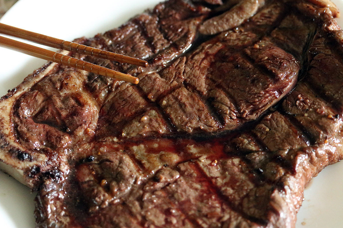 by the time we went to my parents' place, it was already 1:30pm. my mother bought some thin steaks at market basket and my father grilled them in the backyard. he cooked them for a long time so i figured the meat would be very well done, but it was still on the rare-medium side. i don't know what cut of meat it was, but it was very tough and chewy and didn't have a lot of flavor, even though he sprinkled montreal steak seasoning on it and buttered the sides before grilling. i had to add more seasoning to make it palatable, as well use hitting the A1 steak sauce.