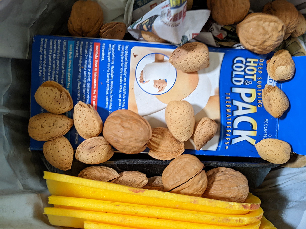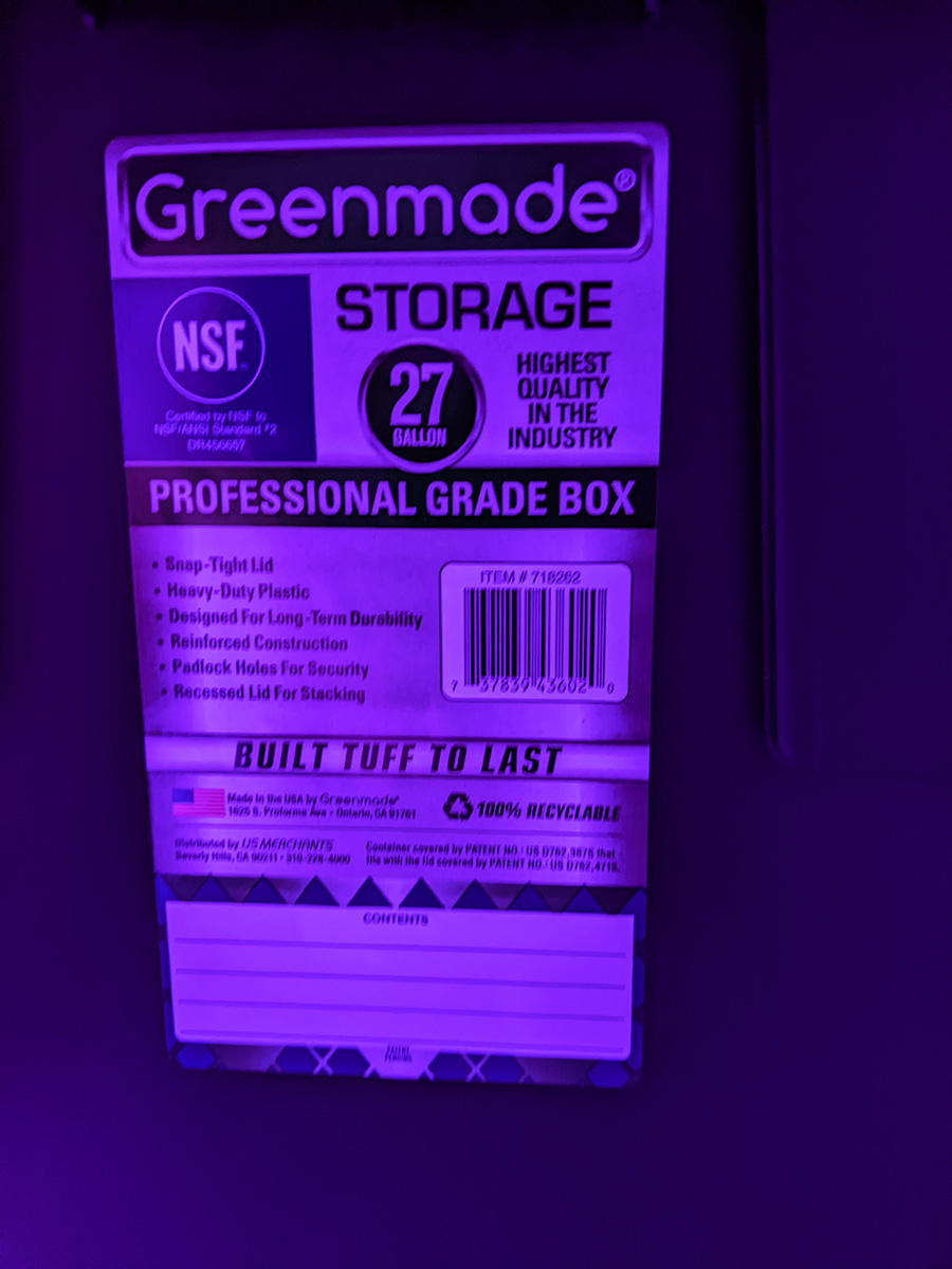 we went back to costco, where we waited in the car for a few more minutes before they finally opened the store. i got a 27 gallon tote container on sale for $9. all the ones i've found of that size were $13+. i didn't like the lid wasn't entirely flat - had a crosshatch pattern - but it's a bargain at that price, just the size i needed, and since i'd be cutting 3" holes into the lid anyway, in the end it didn't matter if it was flat or patterned. it also secured fairly tightly, so hopefully spraying water won't be able to leak out. since we didn't bring a cooler, we ended up using the tote container as a makeshift cooler.