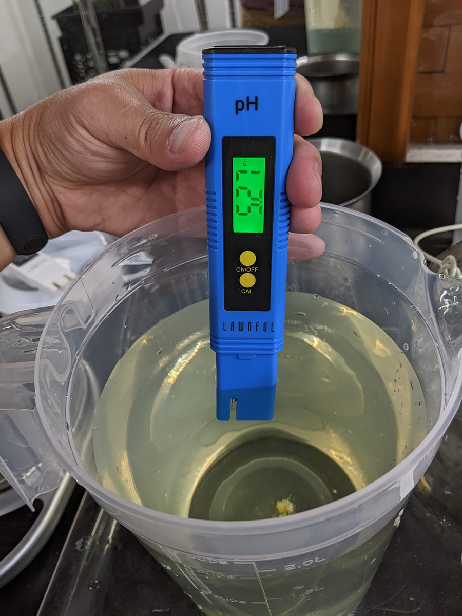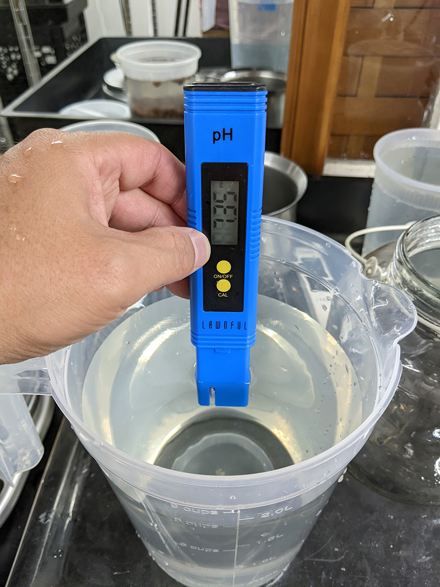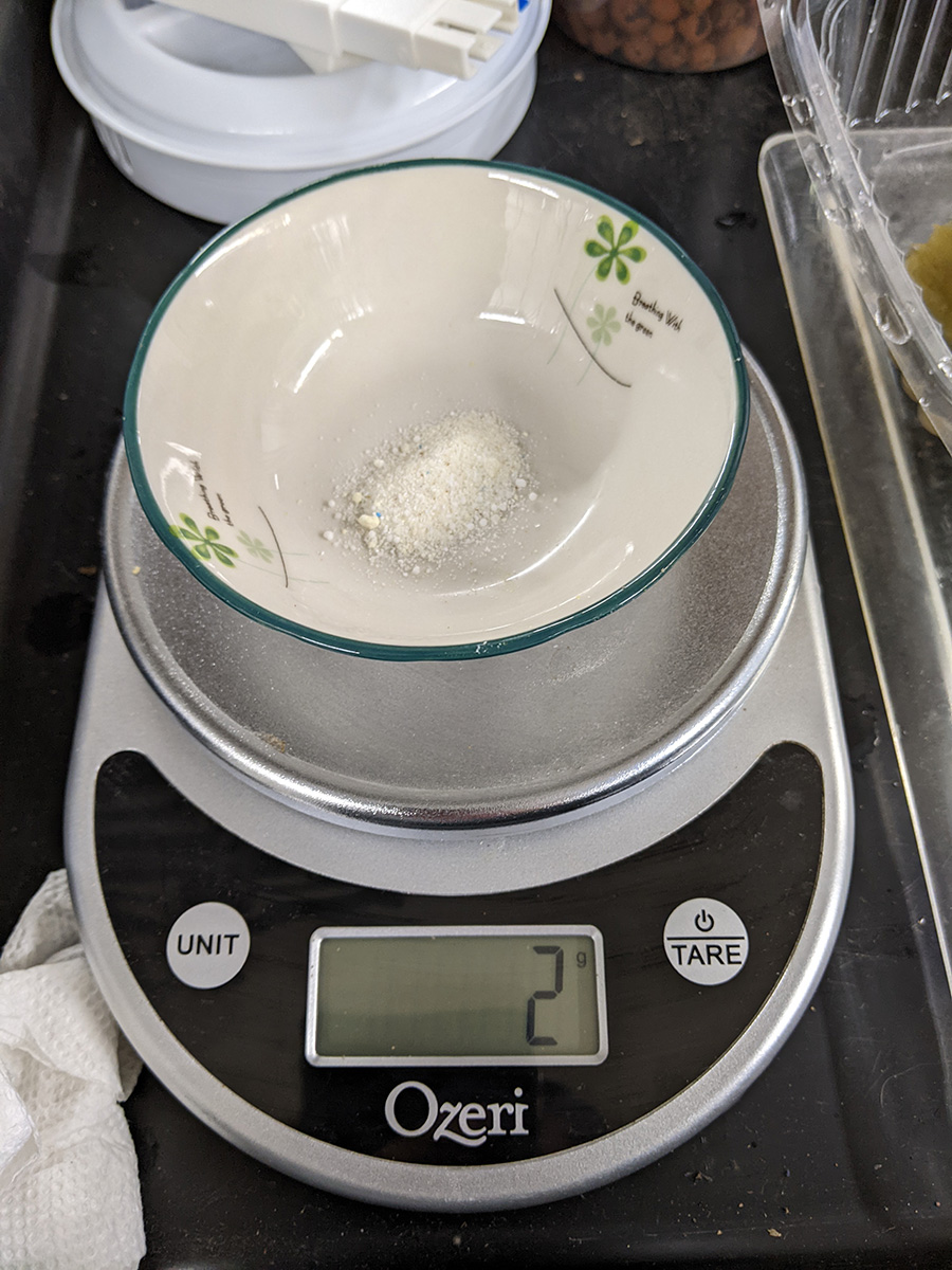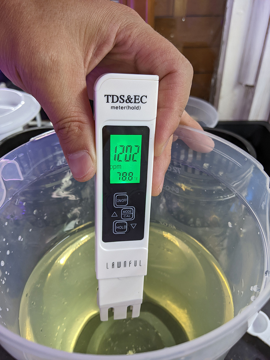 the next hurdle was how much hydroponics nutrient powder to use. i was using general hydroponics maxigro (10-5-14). the recommended value is 5-10 grams per 4L of water. i decided to use the smallest amount - 5g to 4L of water, and did some math to figure out 1.4L of water required 1.75g of maxigro powder. i got the kitchen scale and realized something: the lowest value was 1g, i couldn't get anything in the decimal range. i did the best i could, figured i'd slowly add to 2g and then reduce a pinch to get about 1.75g. i dumped the measured nutrients into the pitcher of rain water and took new readings: pH was now 3.5 with an EC of 1200ppm! later i found out that maxigro nutrients has a tendency to lower the pH. so in my case, pH 6 to pH 3.5, a 2.5 drop. had i known i would've just used tap water (pH 9 to pH 6.5). i could've diluted the solution but that thought did cross my mind. instead i figured i'd get some pH up and down chemicals and adjust the nutrients accordingly.