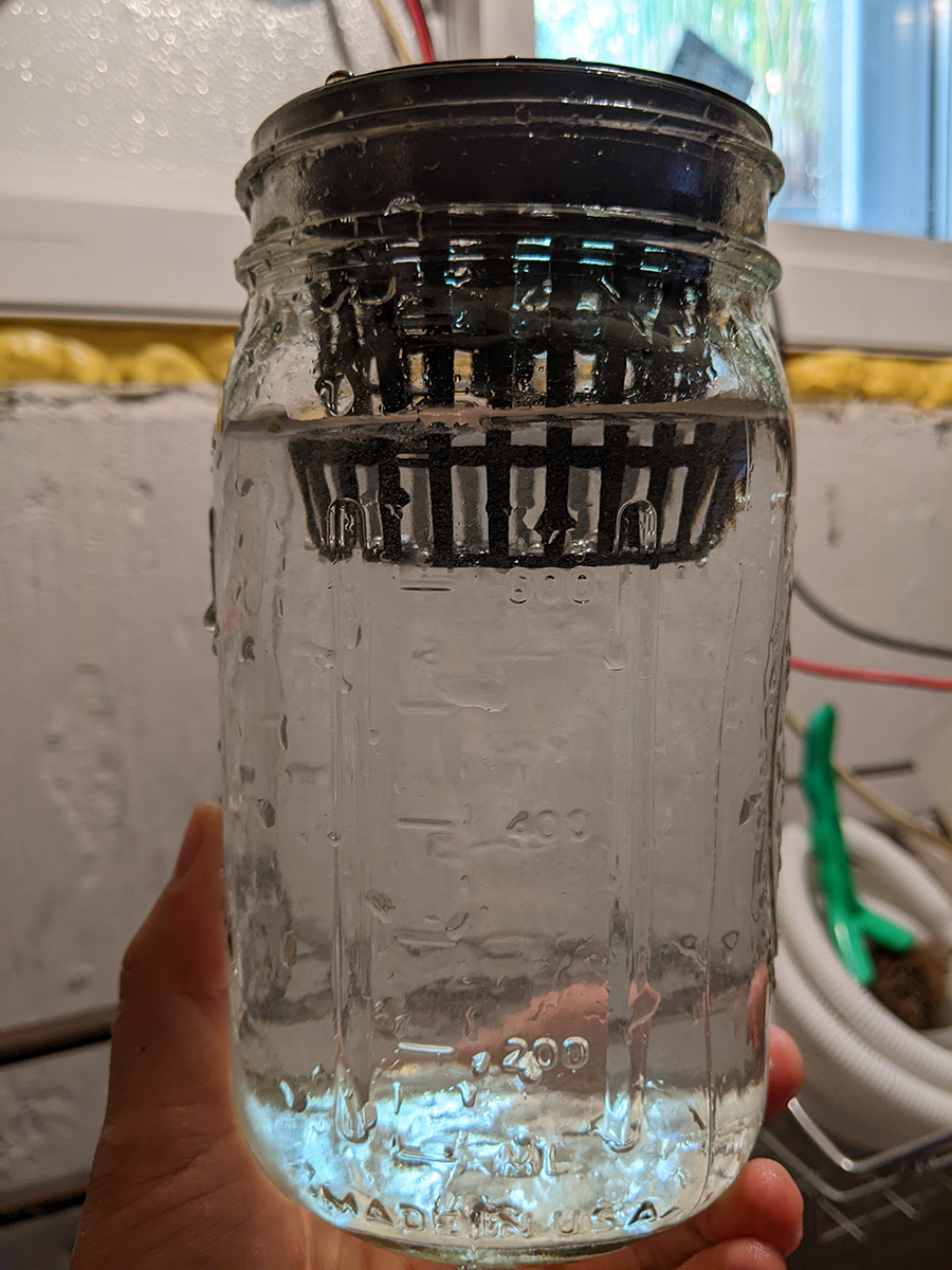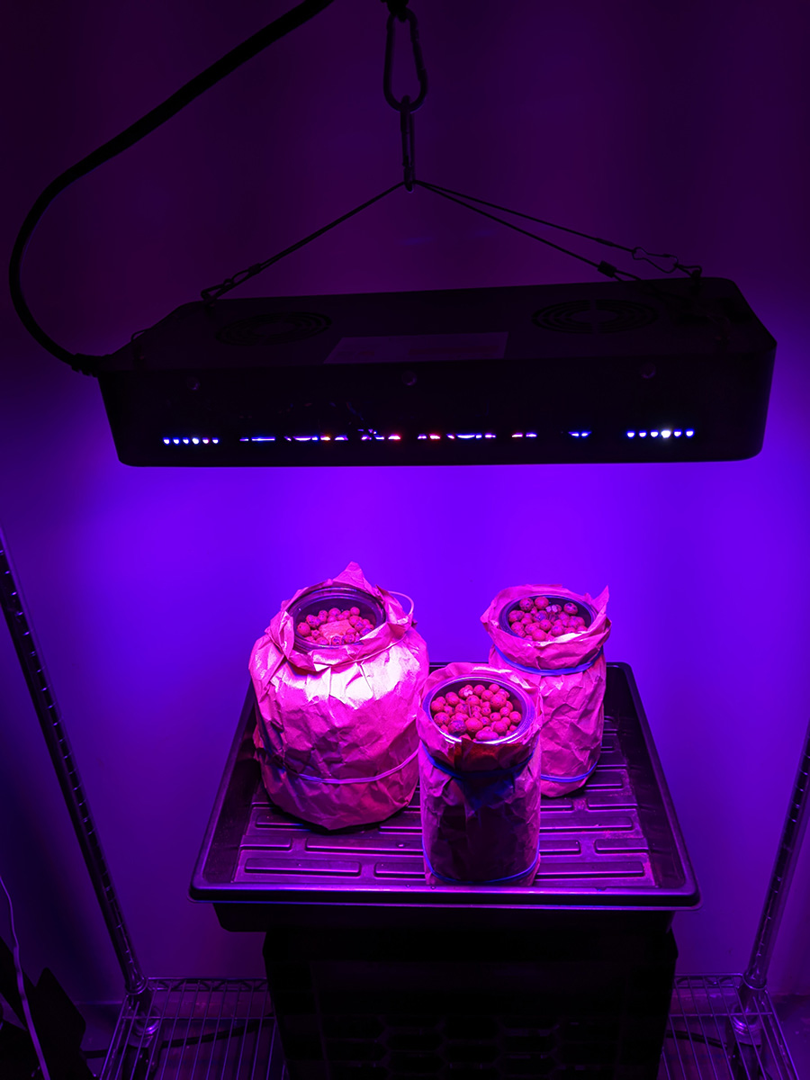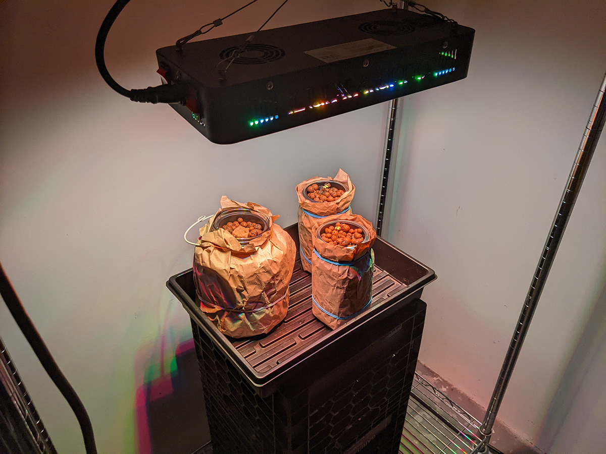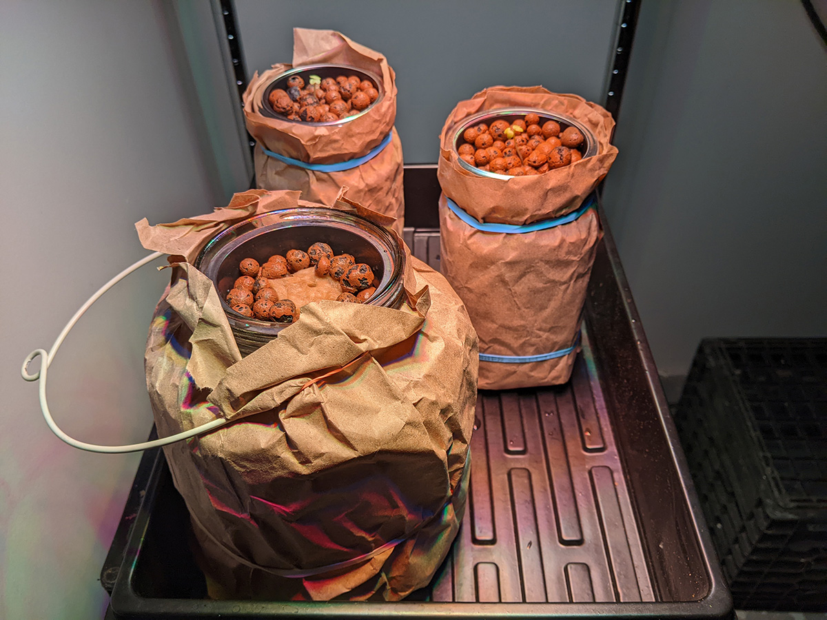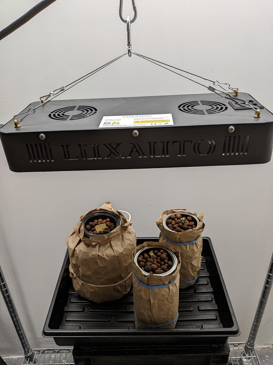 everything looked good and i put the jars underneath the led grow light, until i remembered i forgot a crucial step: covering up the jars so light can't shine into the nutrient solution, otherwise i'd get an algae bloom and that'll kill the roots. fortunately i had some crumpled brown paper packaging material that i used to make jar covers. with that i finally set the jars underneath the grow light.