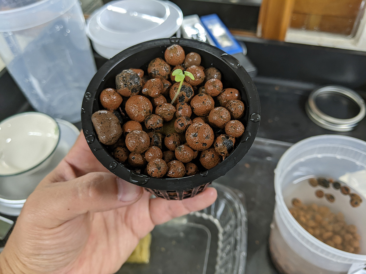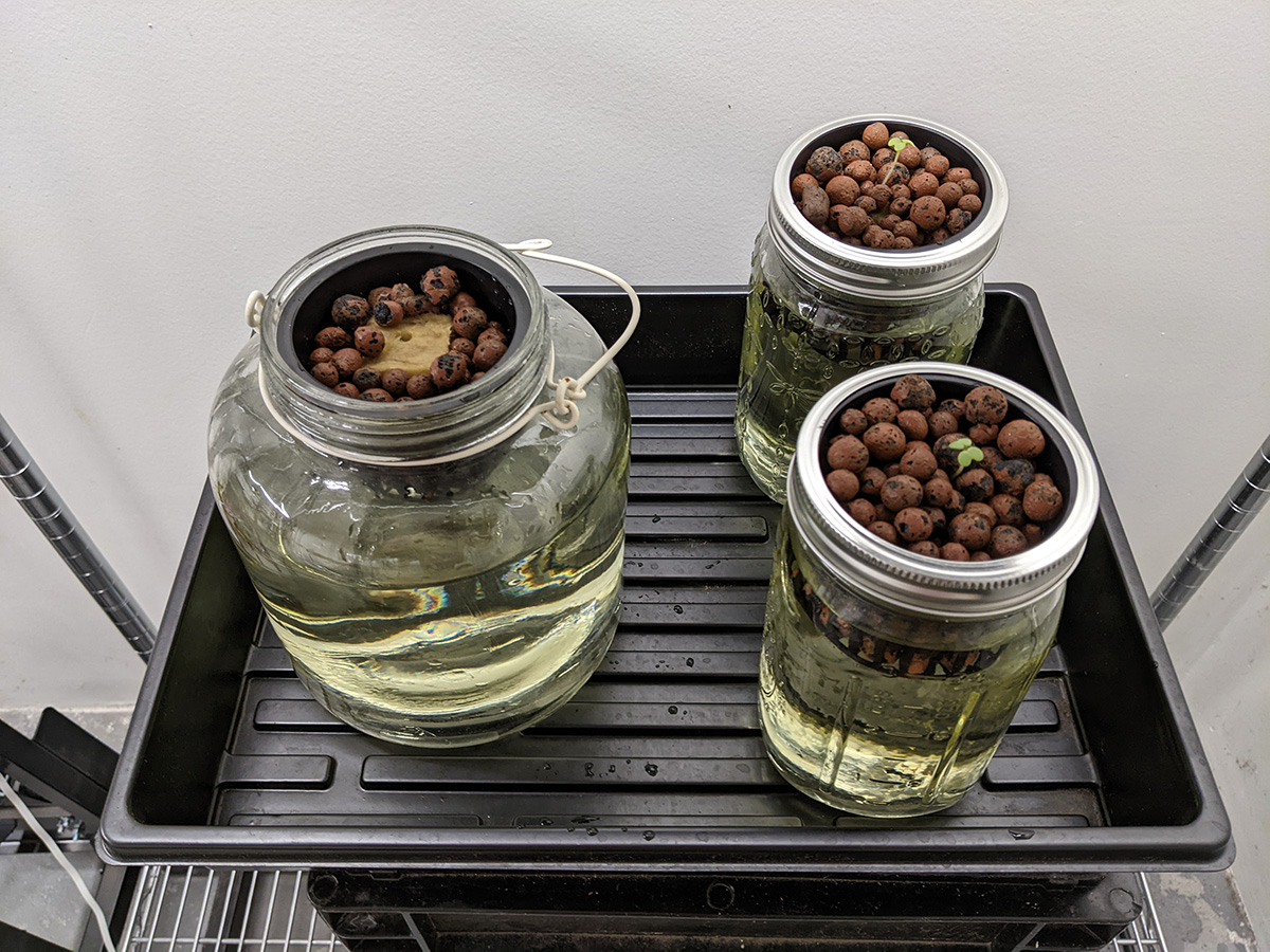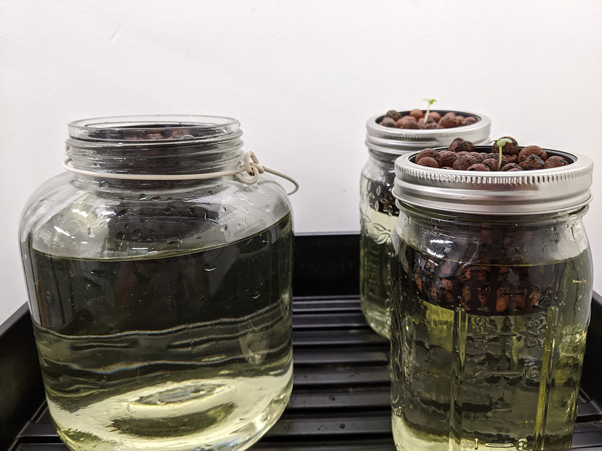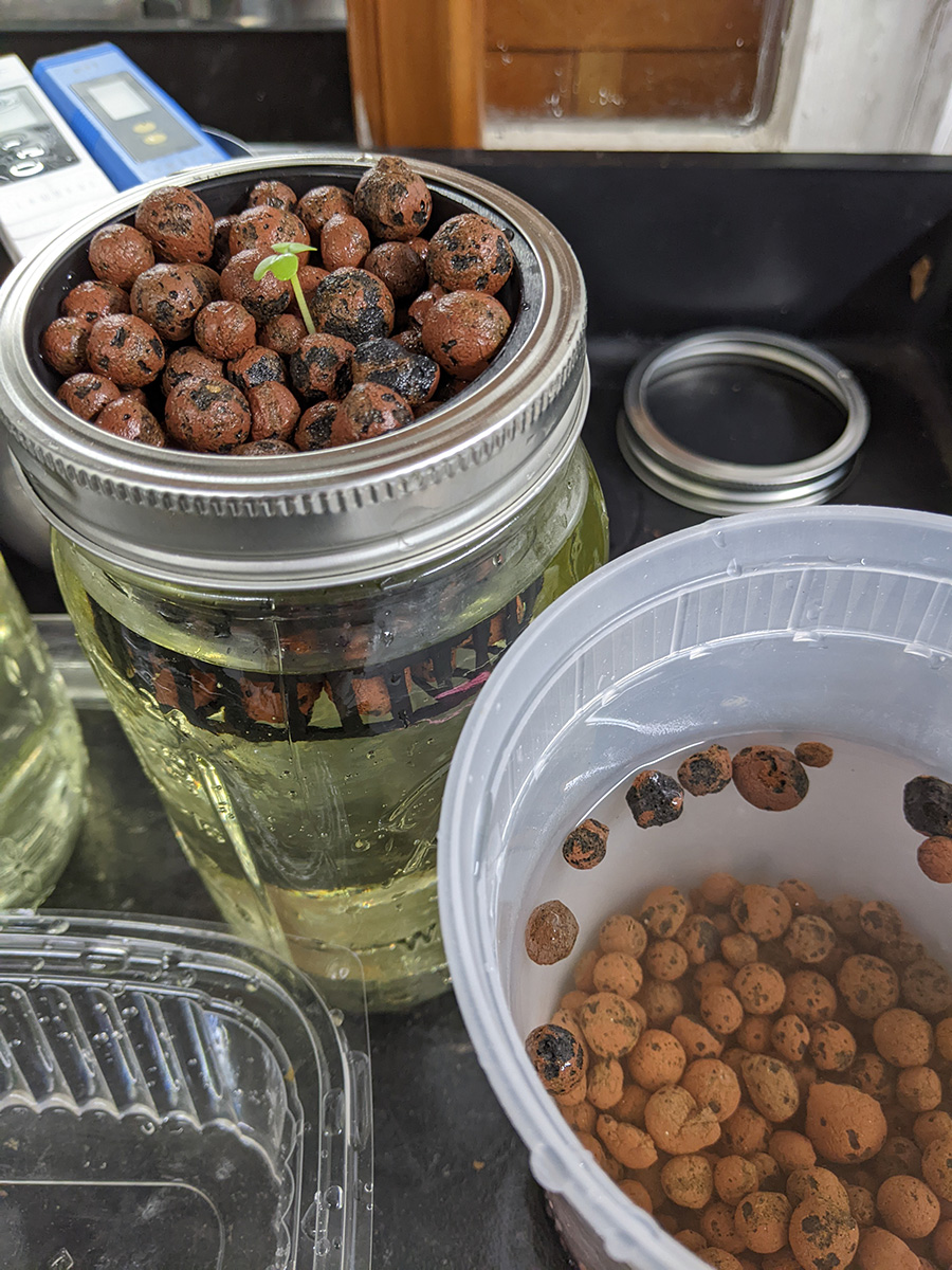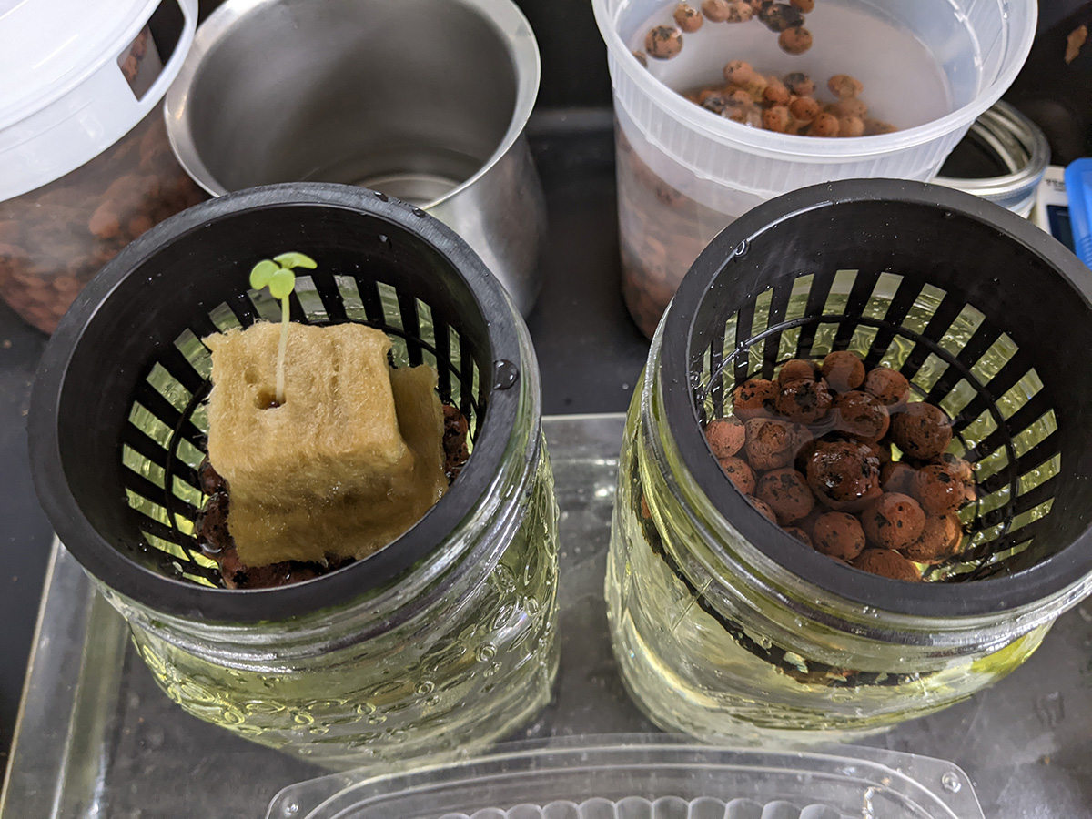 assembling the kratky hydroponic was a simple matter of putting the wet rockwool with mustard seedling into the net cups and using soaked leca balls to hold it in place. the two emerging rockwool seedlings i put in the mason jars, while the rockwool with the yet-to-emerge seedling (though i could see it already germinated inside the hole) i used on the larger jar.