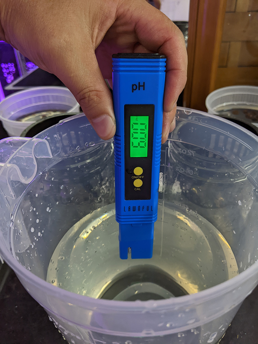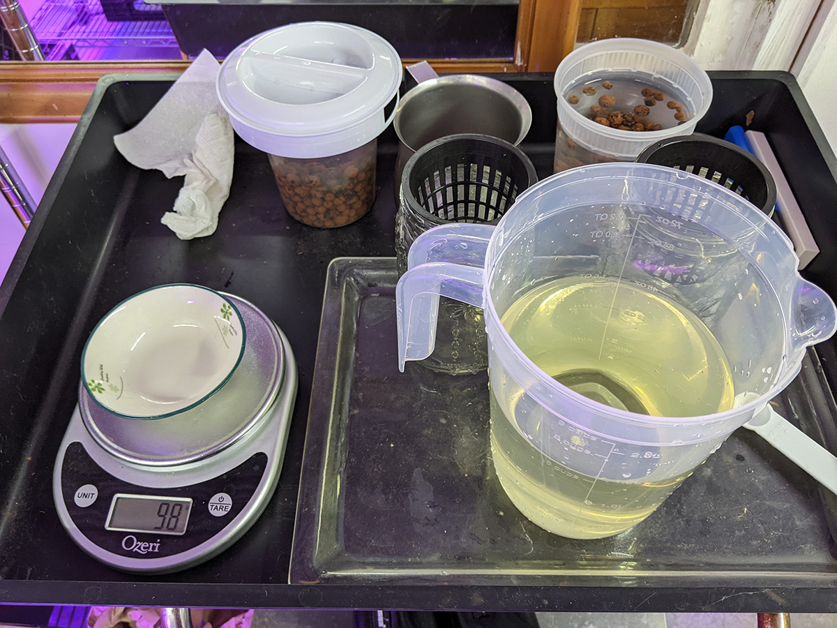 i moved everything to the basement grow room to work. i first measured how much water i needed. i had 2 quart-size mason jars and a large hanging jar. the mason jars required 3 cups of water for it to come up 1/4 on the 3" net cups (for a total of 6 cups or about 1.4L). the large hanging jar required 8 cups of water to come up to the same level on a 3" net cup. i took pH and EC measurements on the tap water. mustard green likes a pH between 6.0 - 7.5 and an nutrient EC of 600-1000ppm. the pH value for my tape water fluctuated, as high as 9.46 and as low as 8.70, so an average of pH 9. i wasn't sure how accurate my pH reader was, and i couldn't calibrate it with the pH buffer powders because i didn't have any distilled water. the EC reading for tap water was 91ppm. out of curiosity, i went outside and tested the rain water: pH 6 and EC 16ppm. i decided to use rain water since it had an optimal pH value.