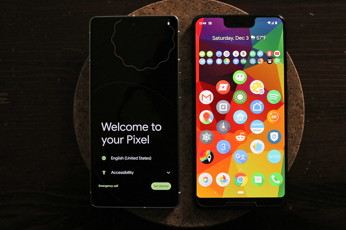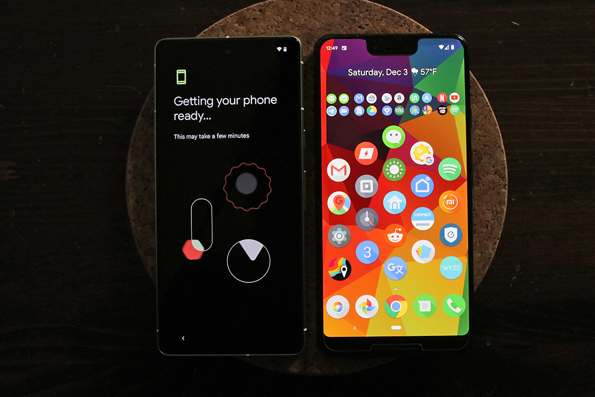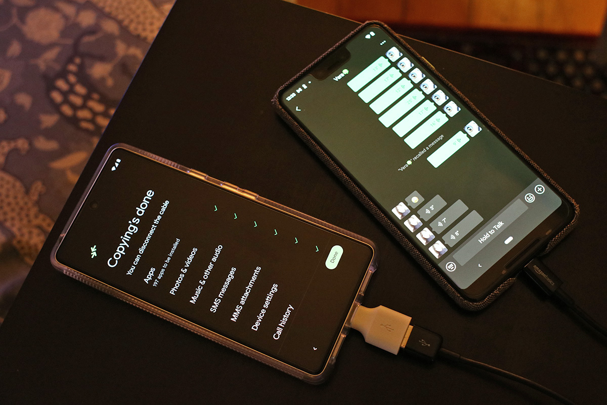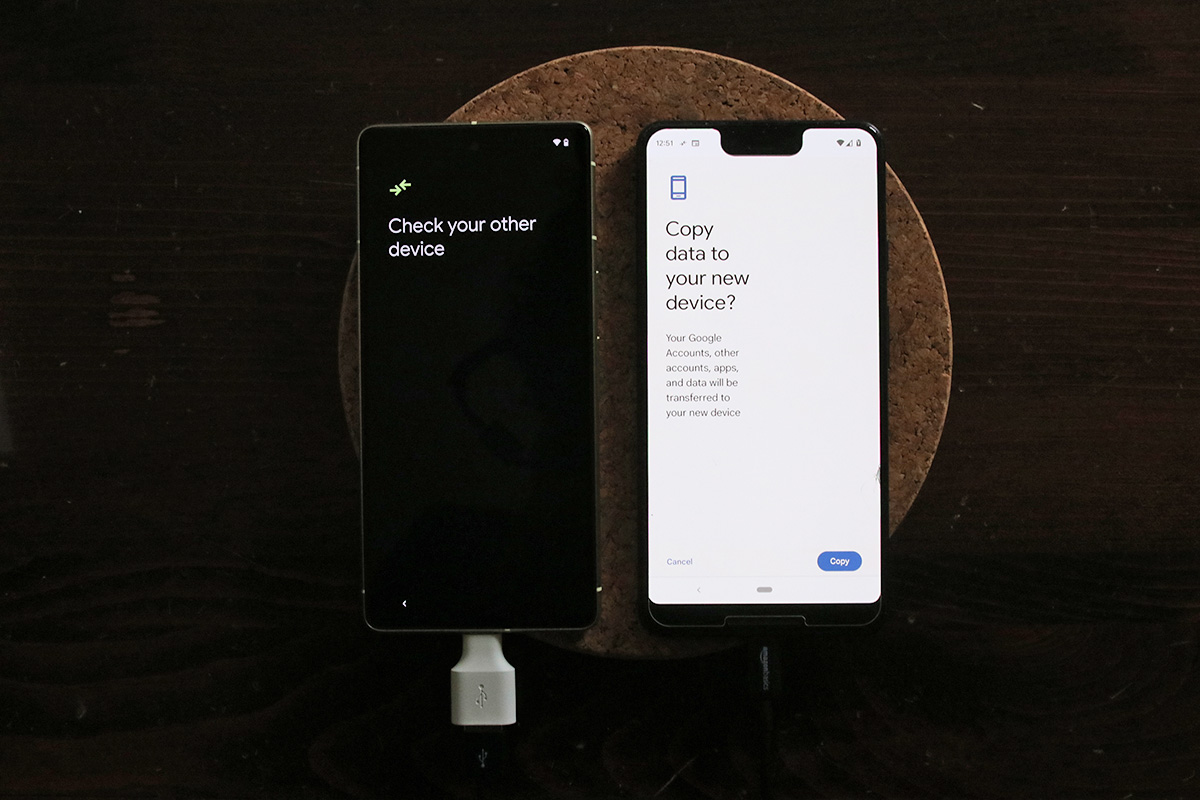 when i finally turned on the 7, it was even more obvious that it was taller and skinnier, but not something i'd notice if i didn't have the two phones side-by-side. both screens are listed as 6.3". because the 7 just had a dot for the forward-facing camera and not a whole notch like the 3XL, there was more screen real estate. the dot is very discreet and i almost don't notice it. the new phone asked me if i wanted to copy over my old data, and i said sure. it then instructed me to use the usb-c to usb-a adapter to connect the two phones together. i'd never done a phone-to-phone transfer like this before. when it asked me to confirm the transfer, i cancelled it because i just wanted to test the phone.