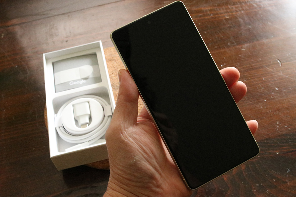 out of the box, google didn't provide a charging plug (a new cost saving measure that many other major phone manufacturers are doing as well), but did include an usb-c to usb-c cable, a usb-c to usb-a adapter, and a sim card pin. without turning on the phone just yet, i could tell the 7 was slightly taller and skinnier than my old 3XL. holding it barebones as-is, it had a pretty good width, like i could possibly operate it with just one hand (that might of course change once there's a protective case).
