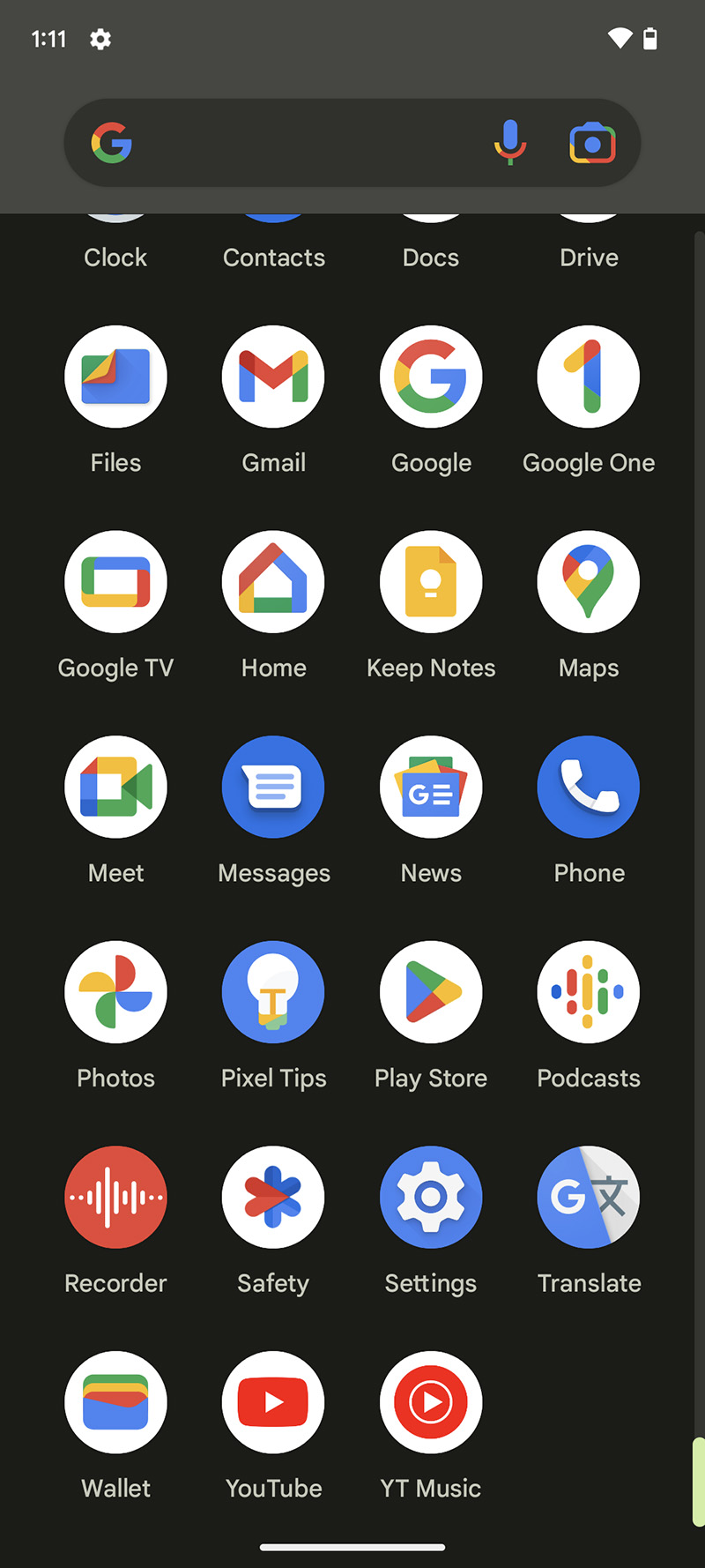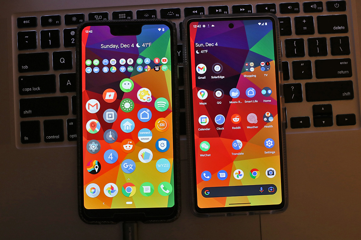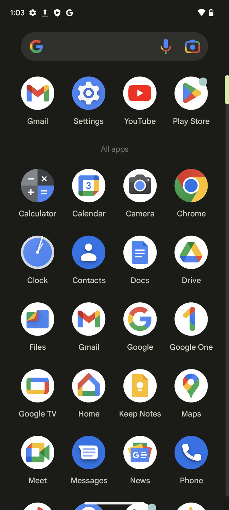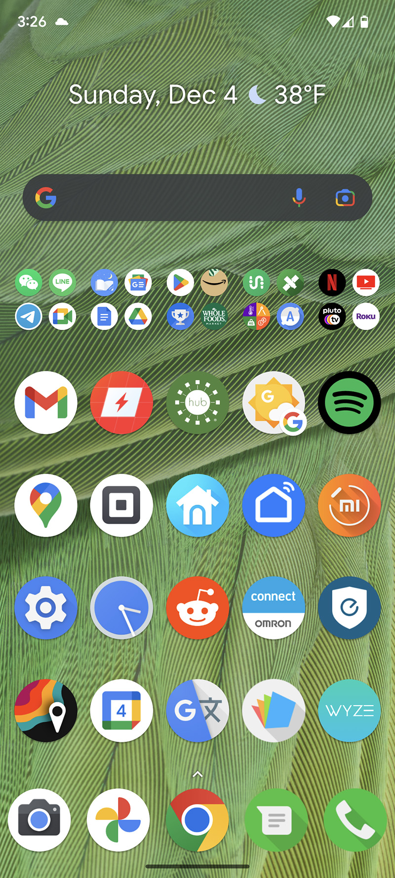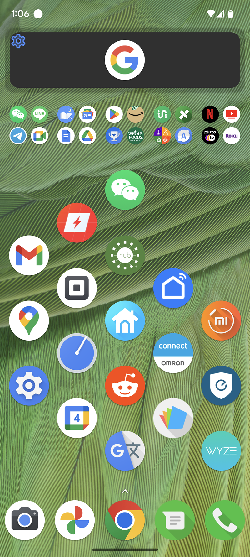 i ended up changing the wallpaper just so i could distinguish this new phone from the one phone. the homescreen had the default icons, i purposely didn't migrate any icon packs. the way i had it before on the 3XL, i patched together several icon packs to get the look that i wanted, but to do it over was too much hassle. besides, i sort of want to try out some new icons. i also rearranged the icons a bit, to make room for the google search bar. i ended up fiddling with the phone until 4am.