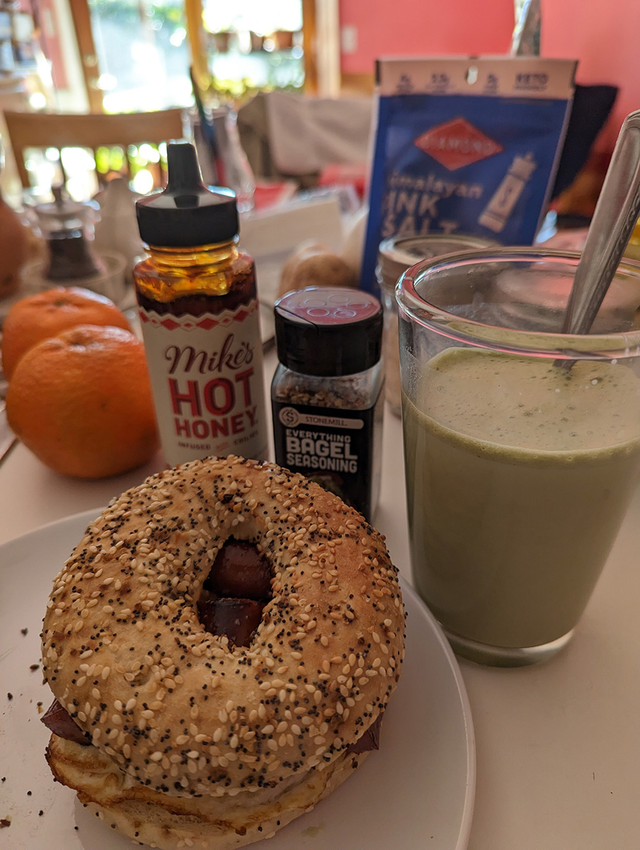 i made a kielbasa egg bagel sandwich for lunch. since i had plenty of milk, i also made a matcha latte, the one this season. there was a period last winter season where i drank one every morning, but when i went searching, i couldn't find the recipe, and i couldn't remember how i made it. so i improvised. i warmed up about a 2/3 glass of whole milk in the microwave for one minute. i dissolved the matcha powder (about 1-1/2 tsp) in a small amount of hot water first, using my electric milk frother. i then poured the dissolved matcha into the hot milk. i didn't have regular honey so i added a teaspoon of hot honey.