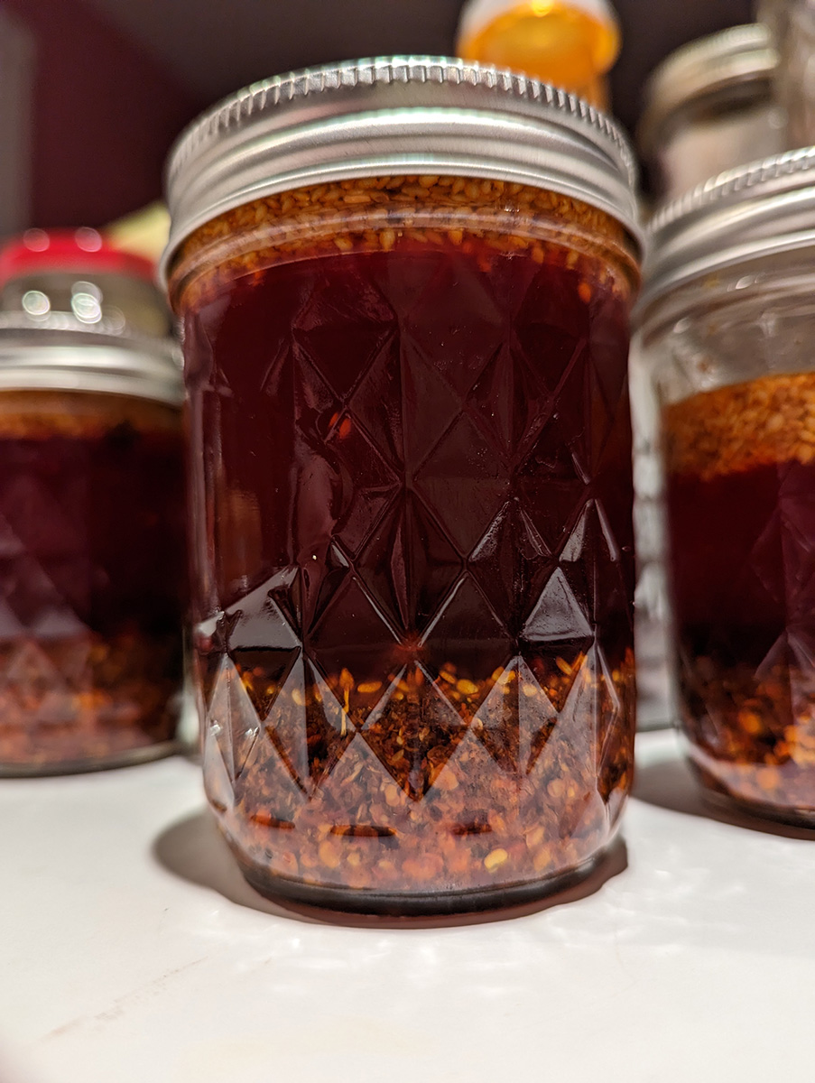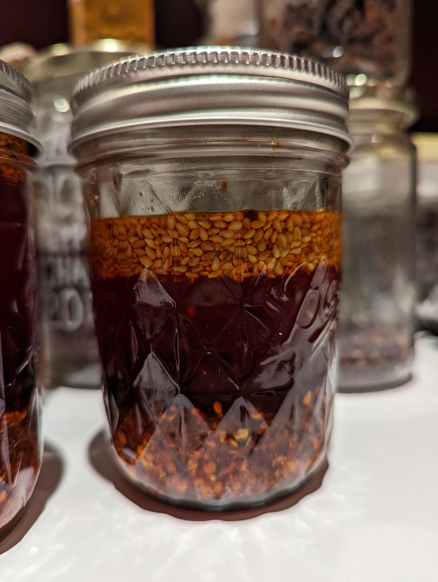 i left the chili oil to cool, adding the sesame seeds i toasted earlier (i forgot to add it beforehand). after a few hours i came back and scooped the oil into half quart mason jars. there was just enough chili oil to fill 3 jars and almost a 4th jar. i tasted some of the leftover oil in the bowl. it was flavorful, but i won't know for certain until i use the chili oil, like a dipping sauce for dumplings. chili oil surprisingly enough is actually not that spicy, not compared to an actual hot sauce.