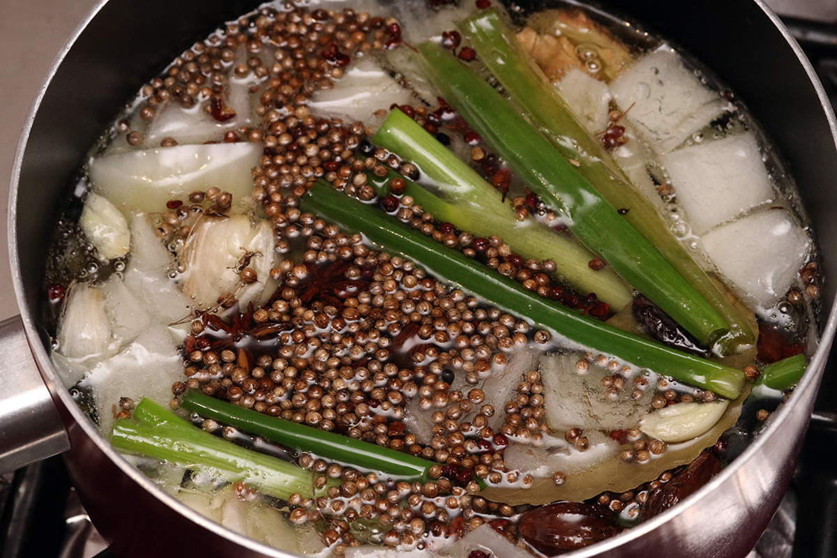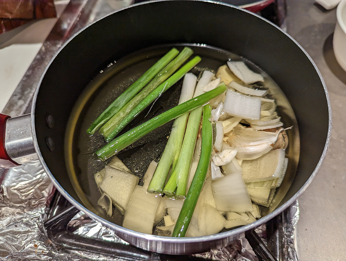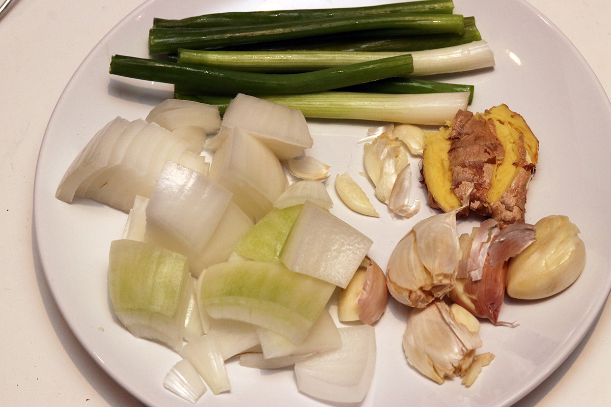 1 piece of ginger, crushed 5 garlic cloves, crushed 3 pieces of scallions 1/2 onion, chopped