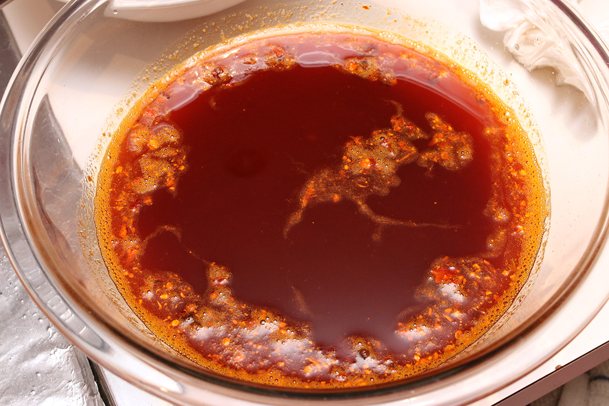 when i came back, i scooped out the vegetables and spices from the oil (as much as i could anyway), then left the oil to continue heating until it reached 300° and i could see a bit of smoke. i then poured about 1/3 of the oil into the chili peppers. i reach that if you "preheat" the peppers, it doesn't scorch. it did fizzle a little bit but not too much. i then poured the rest of the infused oil through a strainer to catch any remaining spice debris. the second pour it didn't fizzle anymore, even though the oil was still plenty hot. i was a little disappointed, if i make chili oil again, next time i'm just going to pour the whole pot of oil all at once to get the maximum fizzle.