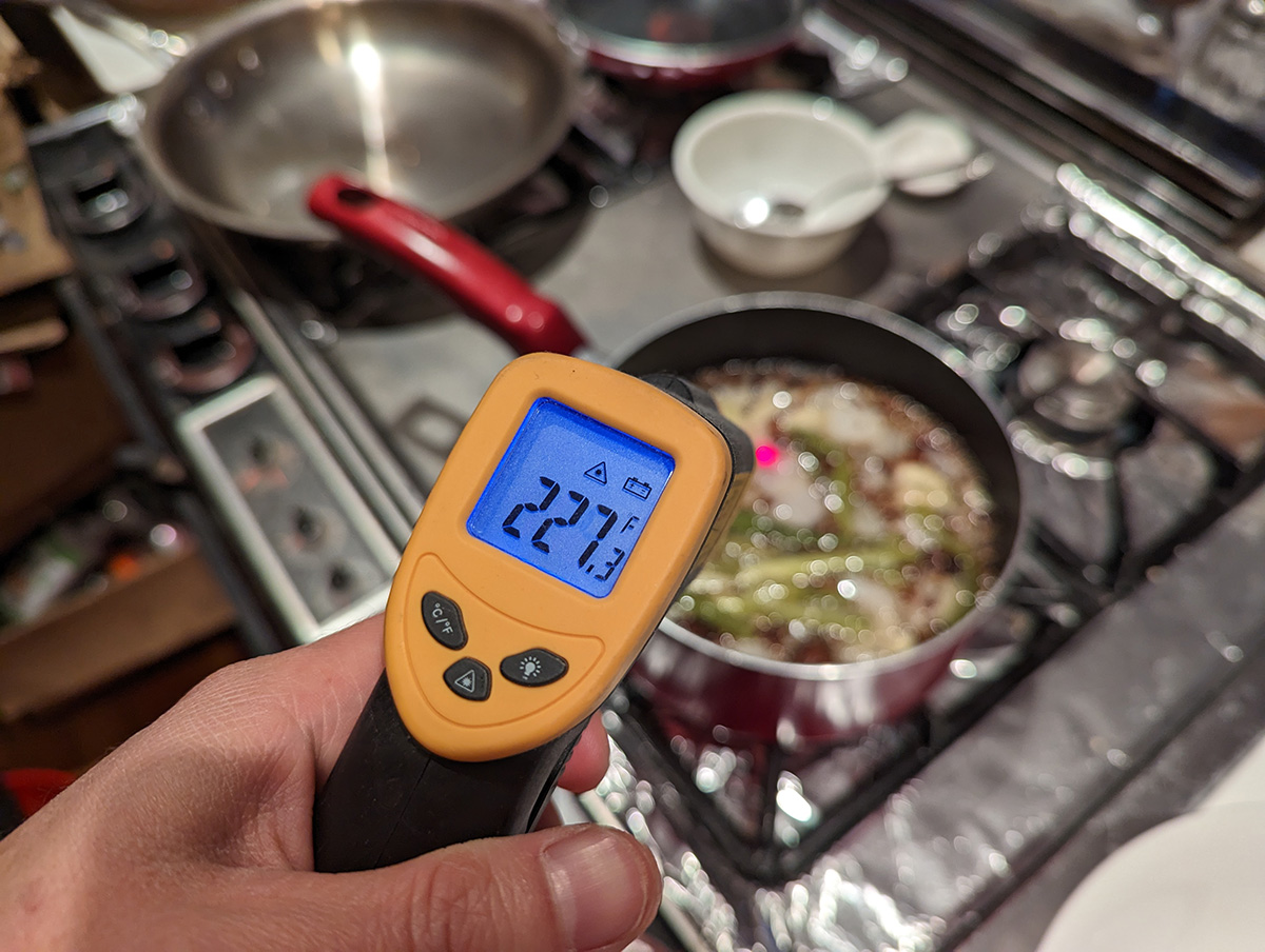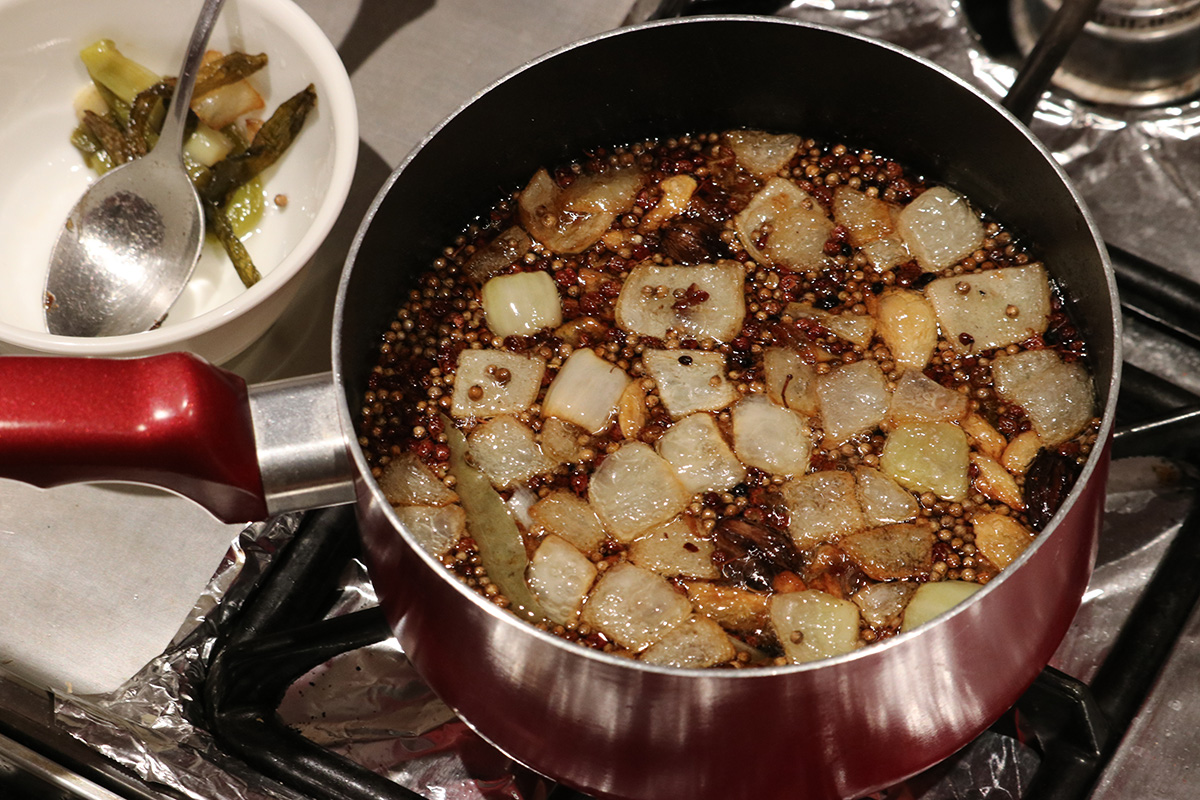 i added the cardamon just because i had it. i wasn't going to add the coriander seeds but saw a recipe that had it so i decided to add it as well. i heated the fresh ingredients in the oil first, to prevent splattering. once it started boiling, i added the remaining dry spice ingredients, then lowered the temperature so it was simmering at 225°F (using an infrared thermometer to take the temperature). i left it simmering for an hour.