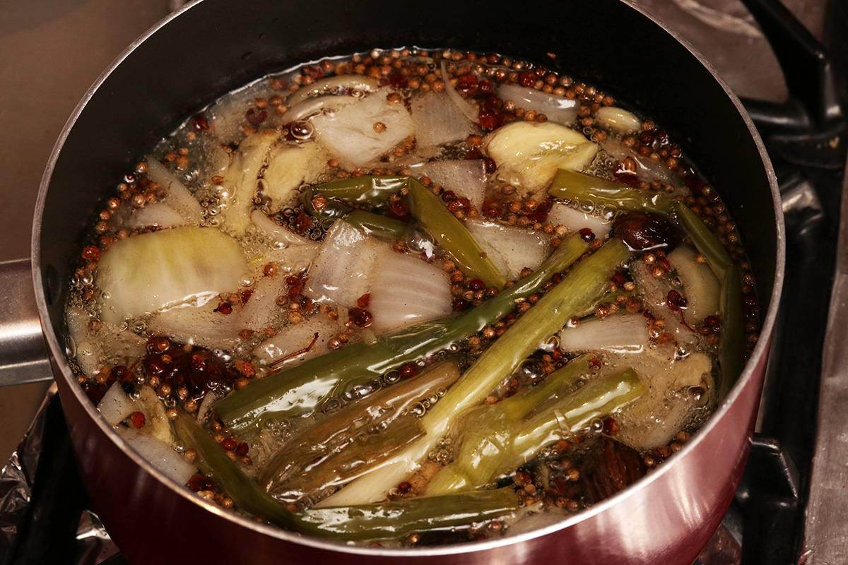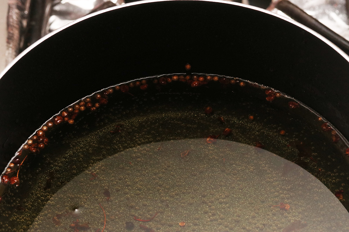 | heat fresh ingredients in oil (to prevent splattering). once boiling, add dry ingredients and reduce to simmer at 225-250°F for 1 hour. meanwhile toast sesame seeds in dry pan until golden brown. scoop out ingredients from oil, continue to heat. add pepper flakes, salt, and sesame seeds to heat resistant bowl. once oil climbs to 300°, scoop out a bit to mix with pepper flakes to prevent scorching. pour the remaining oil through a sieve to catch any leftover spices. once chili oil is cool enough to touch, spoon into jars for storage. | |