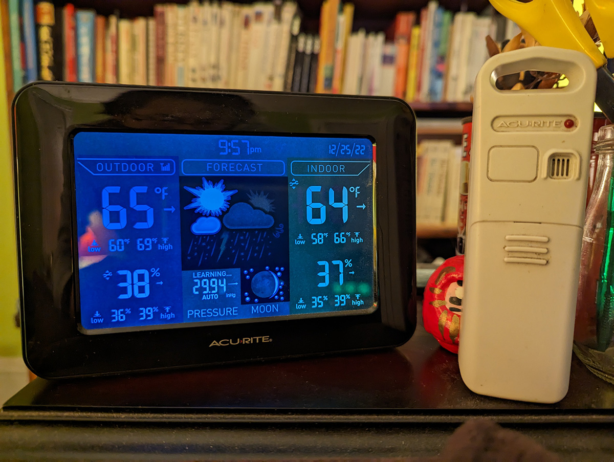 i checked out my acurite remote temperature/humidity sensor. i replaced the batteries, but the temperature and humidity were both still wrong (they should in theory match the numbers from the indoor weather station). the manual said it might take as long as 5 minutes to completely sync up so i left the sensor indoors to let it calibrate.