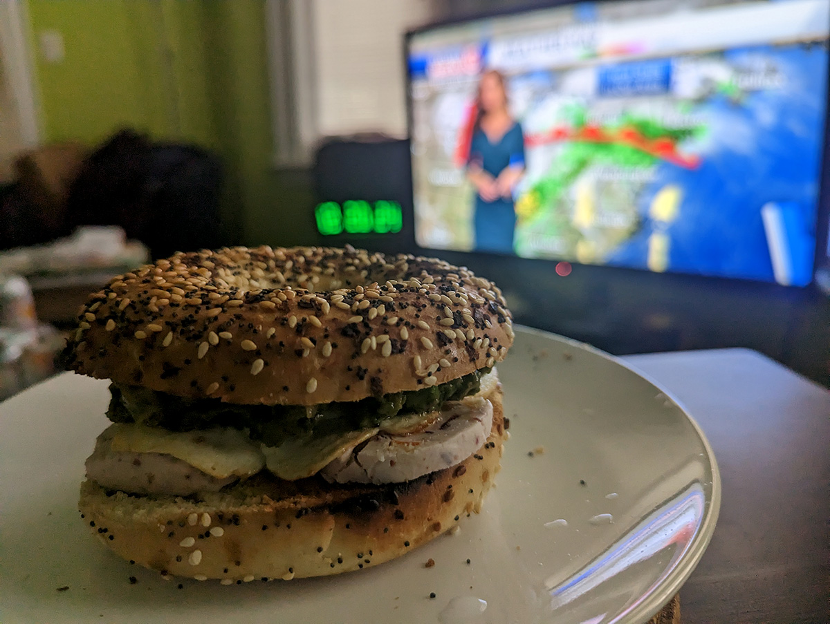for lunch i made an abomination bagel sandwich composing of guacamole, egg, and cranberry goat cheese. the goat cheese came courtesy of my taiwanese cousin, who had a hankering for some sweet cheeses so my parents bought her an assortment when we went to star market.