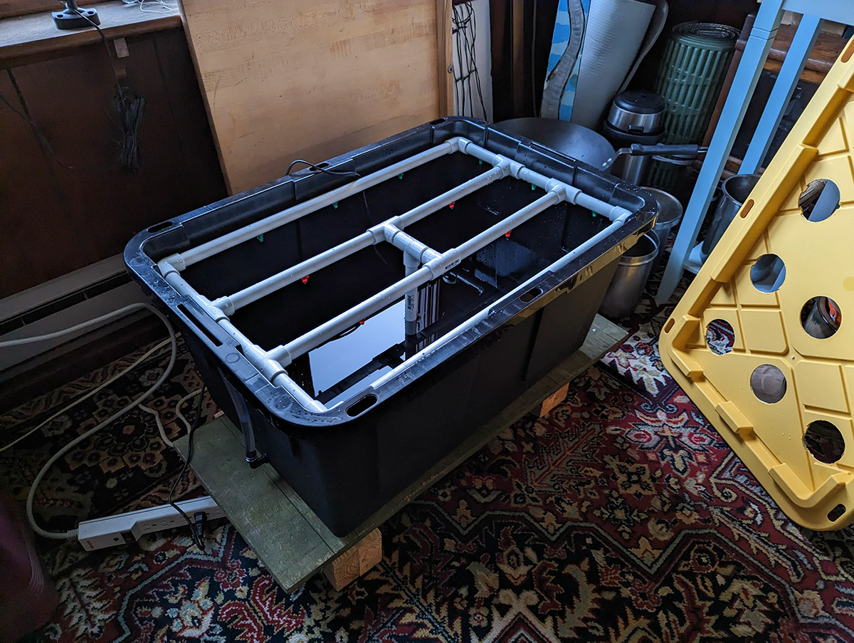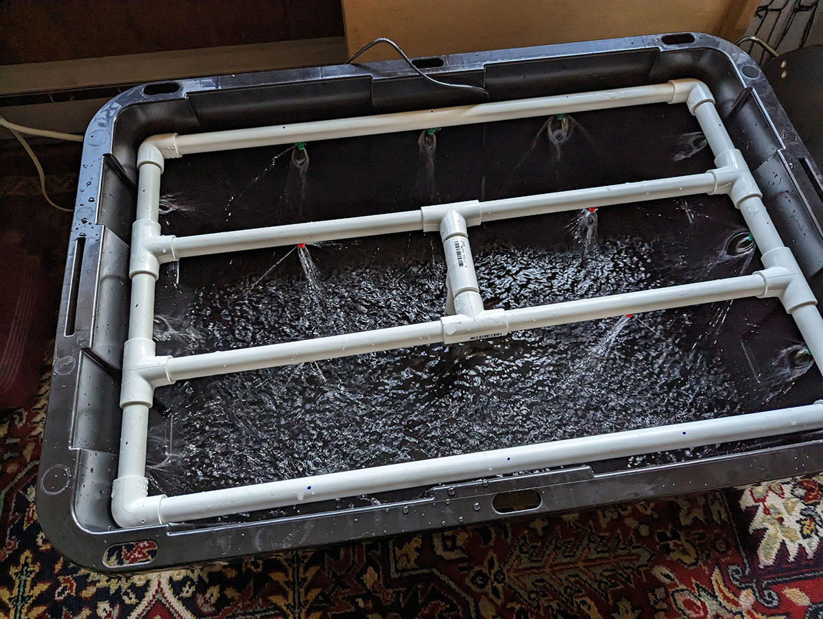 the 180° micro sprayers had a fan pattern, some more fan-shaped than others. the 360° sprayers had a less defined pattern, like the shape you'd get if you held a thumb over a garden hose. the only thing i'm worried about is how i positioned some of the sprayers, the center of the tank doesn't get sprayed. maybe i can fix it by adding more 360° sprayers. i think i'll leave it for now as sort of an experiment to see if the center plants do any worse. it wouldn't be too hard to change, i could caulk the original holes with silicone and drill new holes.