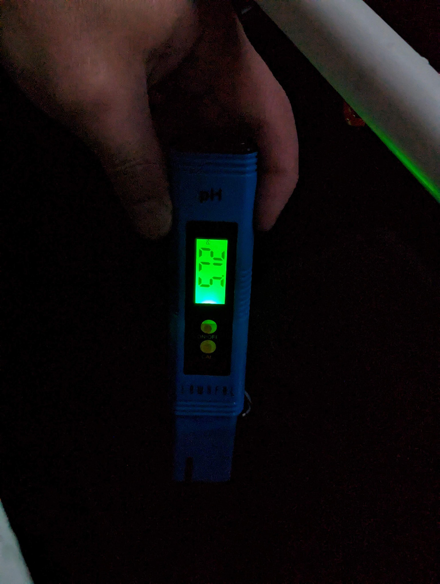 next i added the nutrients to the 10 gallons of water. the instructions for maxi-gro says to use 1-2 tsp per gallon of water. as the plants are still young (the seeds have even germinated yet), i'm going to give them less nutrients, and then increase the amount as they grow bigger. so i decided to add 10 tsp (3 tbsp and 1 tsp) of maxi-gro powder. i forgot maxi-gro comes with its own convenient scoop in the bag. i mixed the powder in a container first, tried to dissolve as much of it as possible. i wonder in the future if it wouldn't be better to dissolve it in some hot water first, as there were still a lot of undissolved powder at the bottom. just for kicks i decided to take a TDS (total dissolved solids) measurement of the concentrated nutrient solution. i think it went off the scale, because the meter said 2000 x10 ppm. earlier i also took readings of the tap water: pH 9, TDS 72ppm. once i added the nutrients, the 10 gallons of water now read pH 5.72 and TDS 675ppm. the optimal values for mustard greens are pH 6.0-7.5 and TDS 600-1000ppm. i found a different source (from india of all places) that said optimal values are pH 5.5-6.5 and TDS 600-1200 (EC 1.2-2.4).