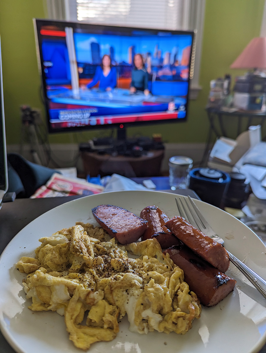 i made some scrambled eggs and kielbasa sausage for lunch. i must've forgotten how to do it because i grilled the sausages first in a dry pan, scorching them and leaving a burnt smell in the house for the rest of the day. i ended up running the air purifier all day but the damage was already done.