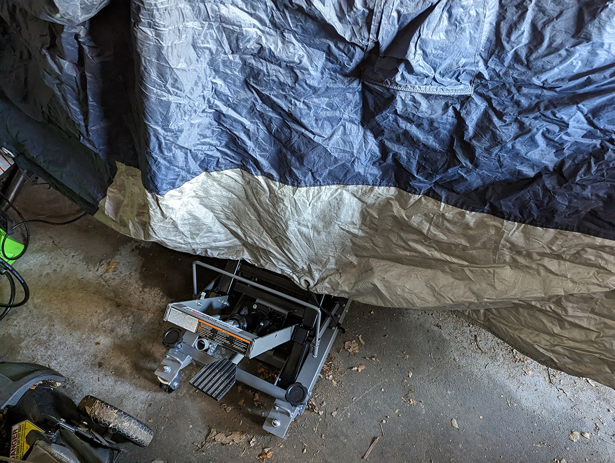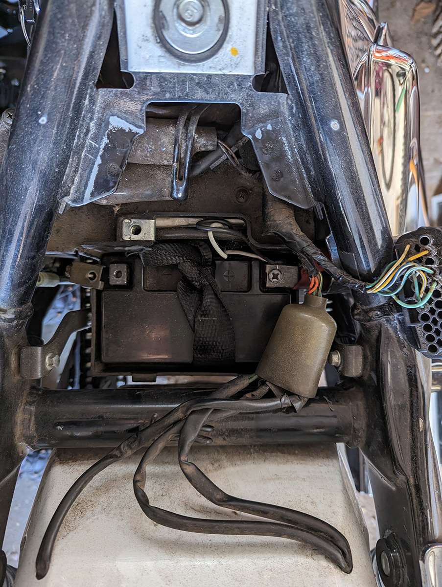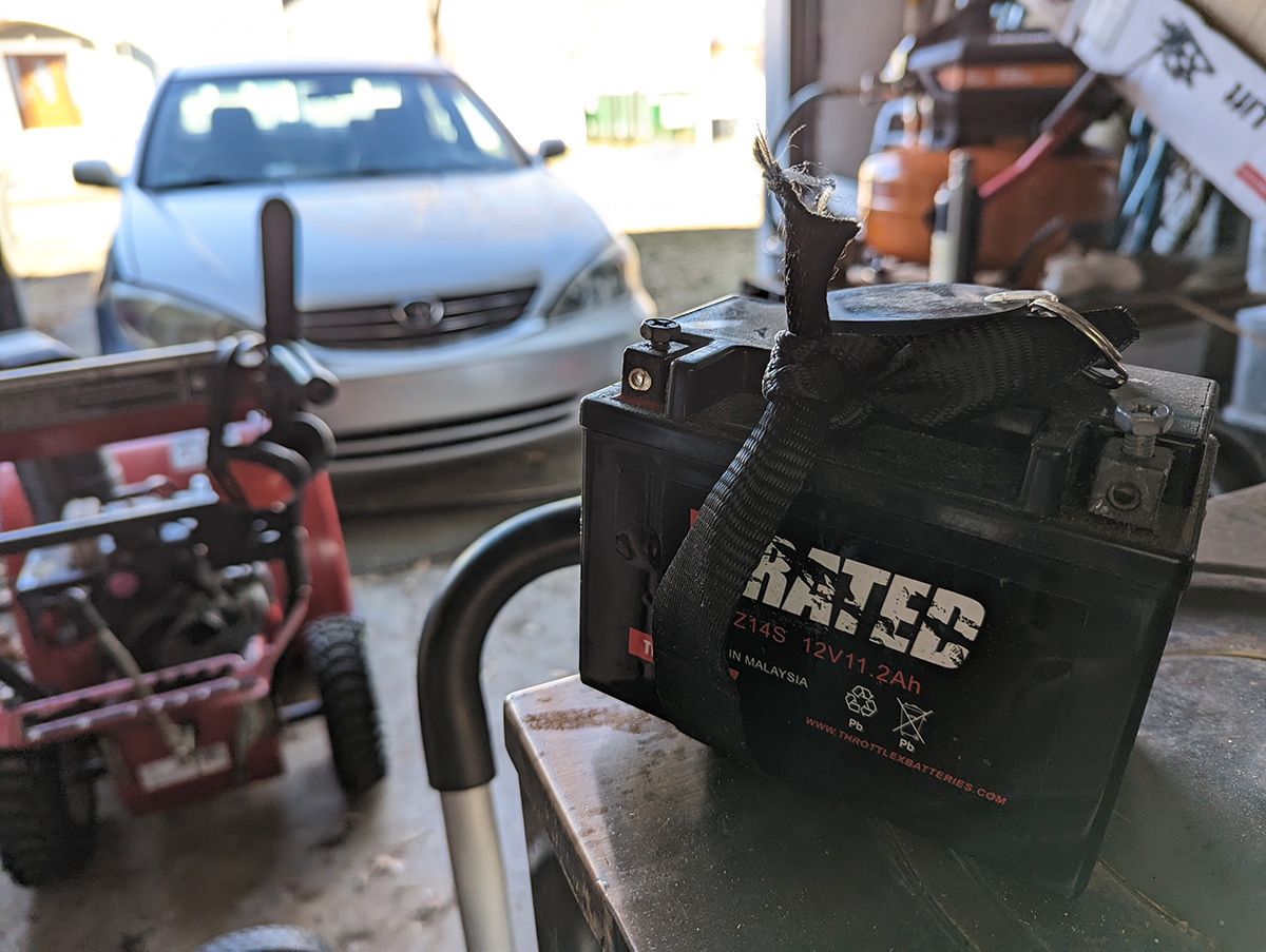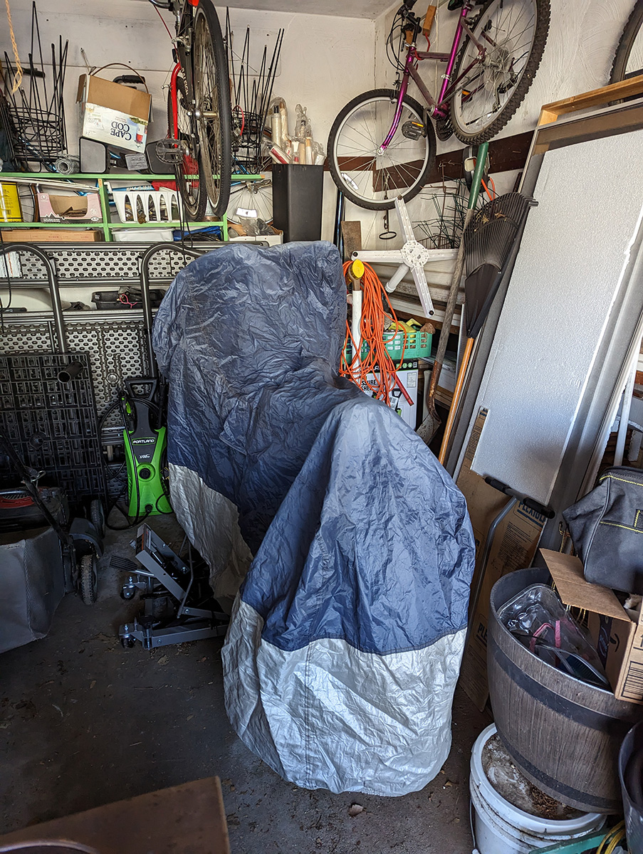 in the garage i tried to start the motorcycle engine again. when it wouldn't turned on, i figured all the gasoline in the carburetor had been used up, which was my cue to remove the battery and trickle charge it inside the house. i reassembled the bike, put the cover on, and left it to hibernate until spring.