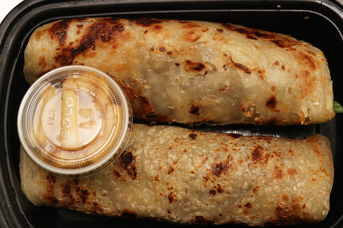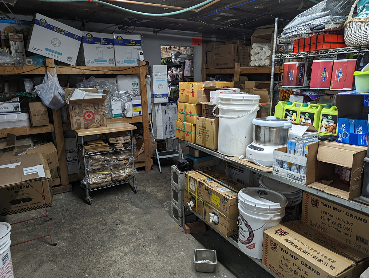 i ended up staying at the cafe for more than 2 hours, between 2 and 4pm. i helped my mother finish making a new batch of tea eggs (30), then cooked a pot of black noodles. i then moved all 4 cases of the new beef noodle takeout bowls down into the basement and did some decluttering. i left with some readymade fried pancakes stuffed with braised beef.