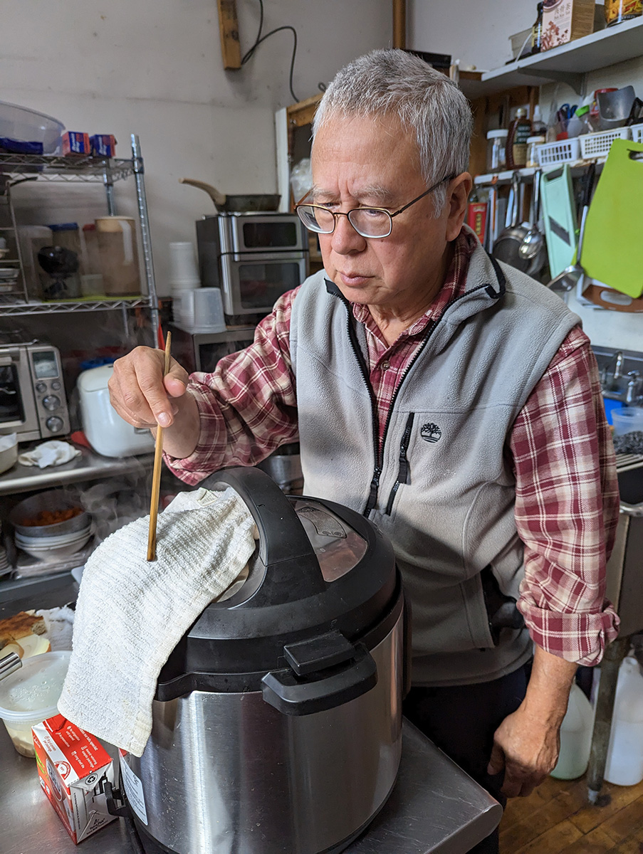 my parents waited for me to show up so they could start making the century egg pork bone congee. we doubled the portions from this past weekend: 2 cups of rice, 20 cups of water. added to that 2 packages of bone-in country-style spare ribs that'd previously been boiled for a few minutes, the 8qt instant pot was just barely large enough to fit everything. we left it to cook, took over 1-1/2 hours. the final rice porridge was bland to the point of tasteless but my sister told us not to add any additional salt because her customers prefer sodium-free. fortunately the included side dish of zhacai was salty, but if i was making this congee for myself, i'd definitely add more salt.