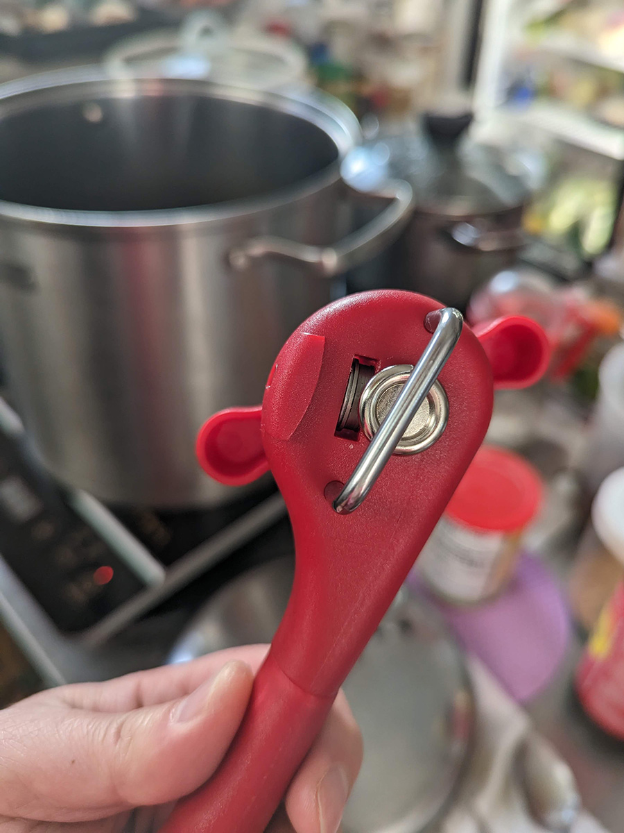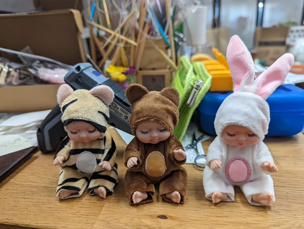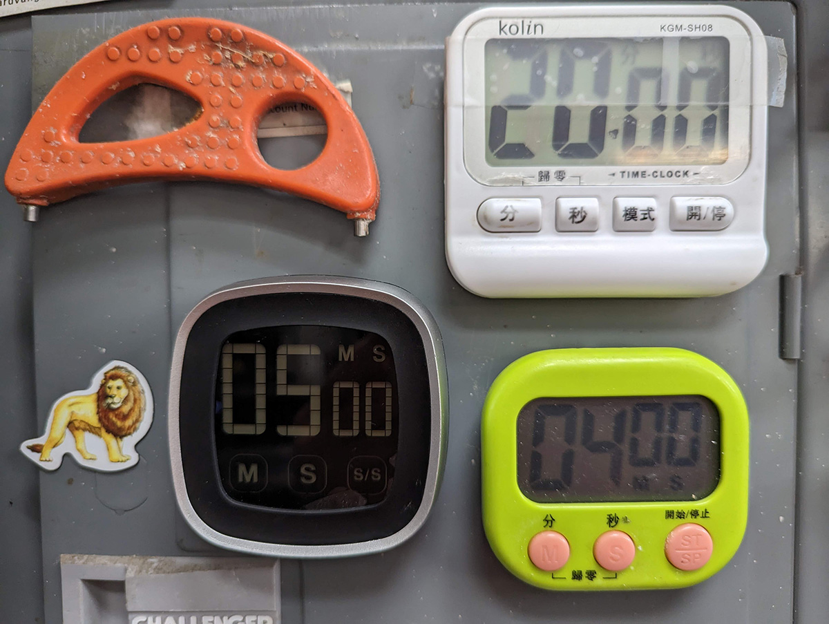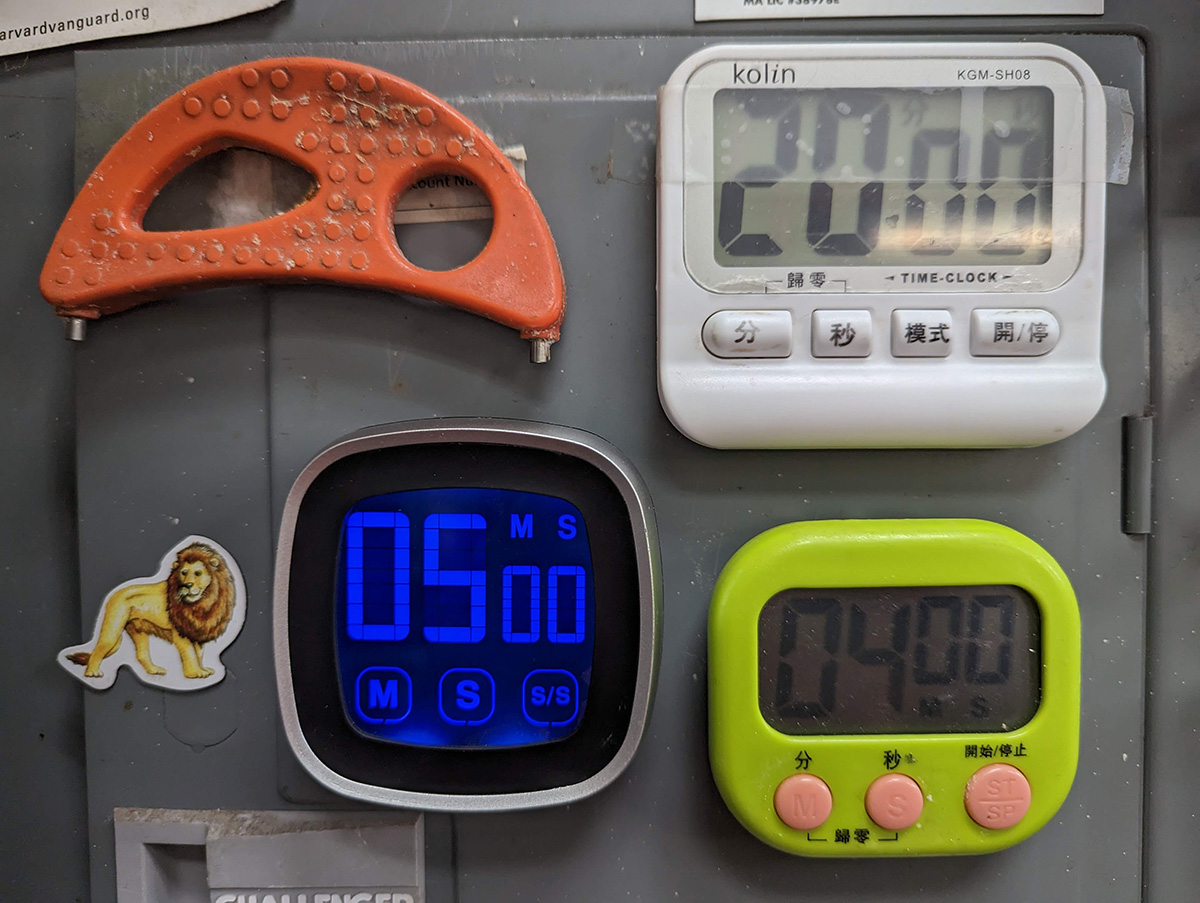 we then opened the temu package. it included a bunch of miniature dolls my mother had purchased. she told me when she was a little girl, she was too poor to have dolls. in the package was a safety can opener, something i'd only read about online, but now had one of my very own to play with. there was a fancy timer with touch screen buttons and illuminated display (blue numbers on black background). it didn't come with batterys (2 AAA's) but i pilfered the ones from an infrared sensor just so i could see the new timer in action. it only glows when you start the timer, then it fades to grey numbers on black background, which can be a little hard to read.