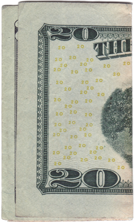 1 this is a photo of the actual $20 that i found. you wouldn't believe how difficult it was to get this image. i was able to scan the money just fine, but when i tried to import it into photoshop to make edits, it wouldn't allow me, some kind of adobe anti-counterfeiting measure. so the only way to edit the image of the banknote was to use the free open source image editor GIMP. GIMP has its fans, but i found the interface to be clunky and hard to use, and took me a while to cut out the bill and turn it into a png file.
