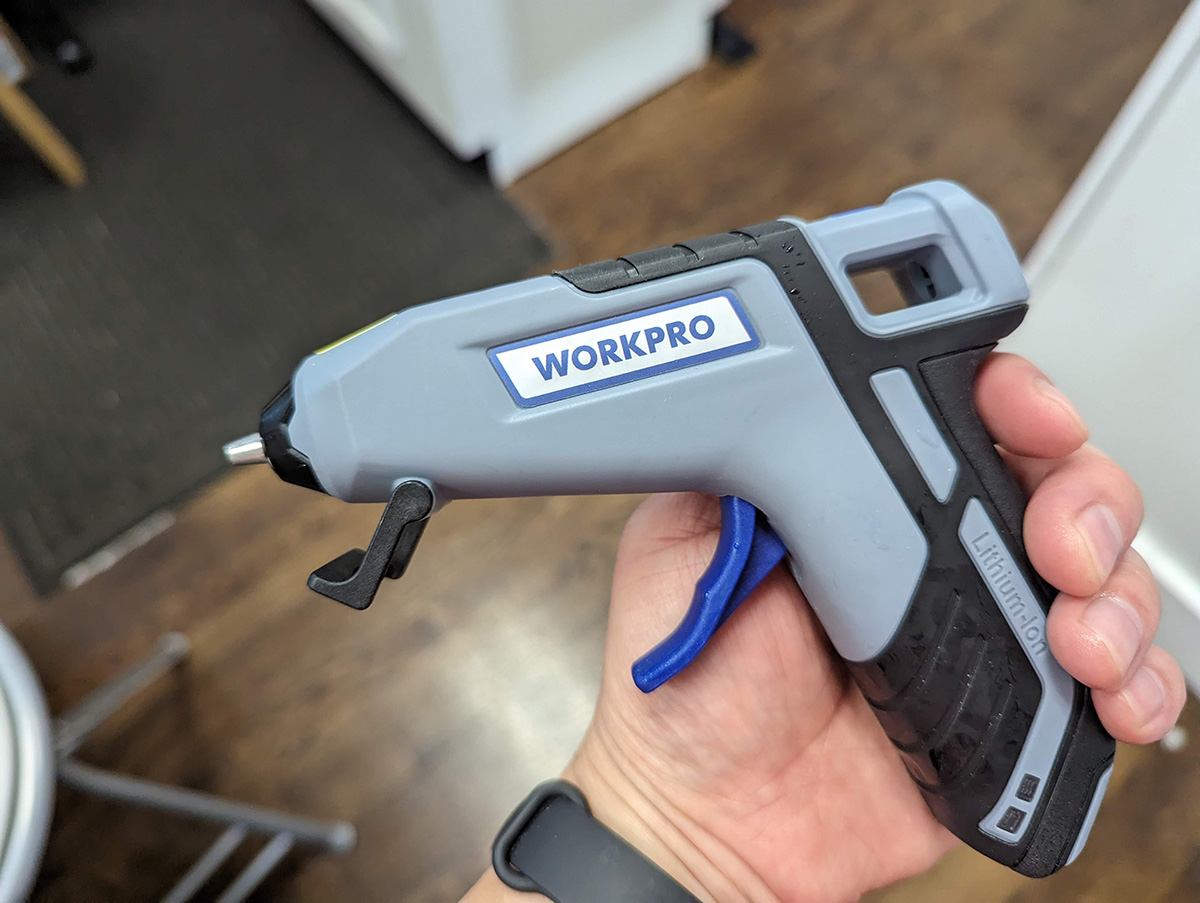 i didn't return to the cafe until 30 minutes later. i opened the amazon package first, which was the workpro glue gun. we plugged it in to recharge it. i thought my mother was going to use it for her crochet flowers, but the first thing she did with it was to glue a rubber baseboard that kept falling off. it didn't work because she didn't apply enough glue, but it'd be more effective just to nail on the baseboard. she was impressed by how the cordless glue gun automatically fed in the glue stick. apparently her old plug-in glue gun didn't do that, and she had to manually push in the glue, and then use another glue stick to push in the first stick.