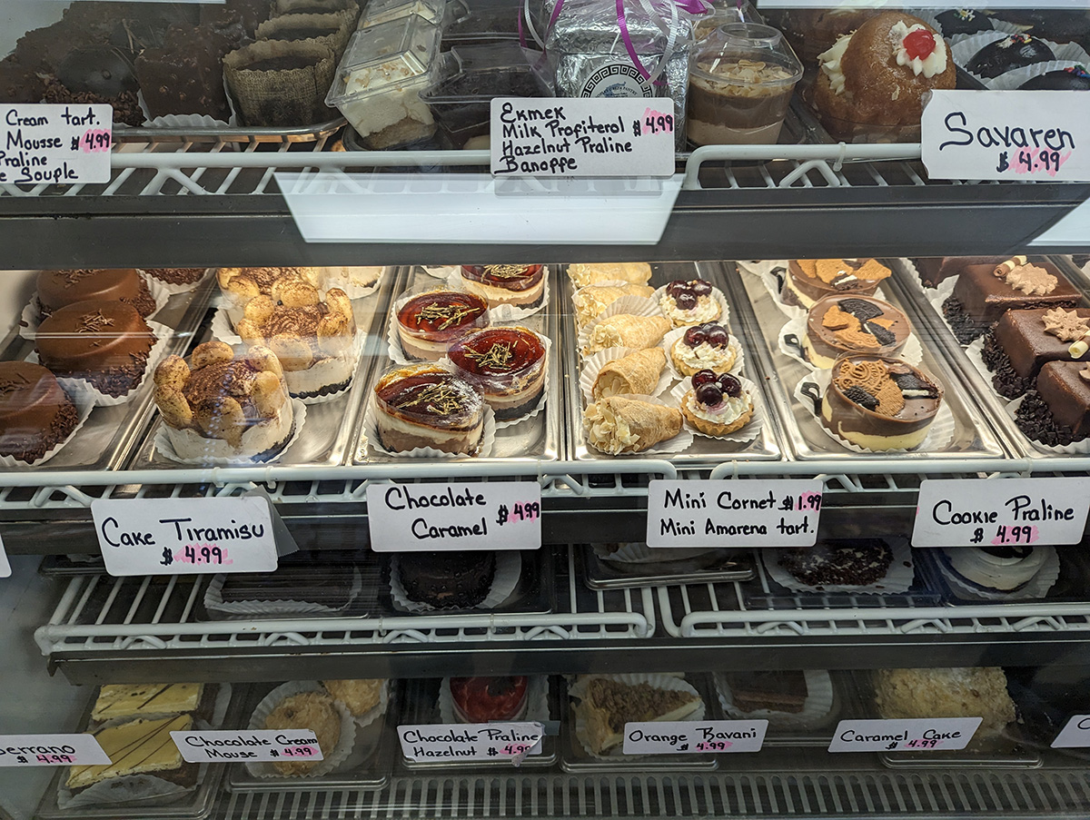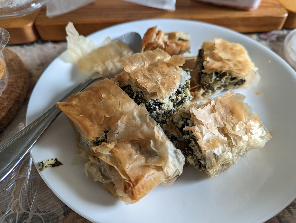 i made it back to belmont by 2:30pm. my mother and i walked up to sophia's greek pantry to get a few more things. my mother got another bottle of salted yogurt drink, but we also tried a container of their fresh grek yogurt, in honey flavor. we picked up a container of taramasalata dip ($5.99), some pita bread, and tried some of their hot pies - spinach feta ($4) and sweet cinnamon custard ($5).