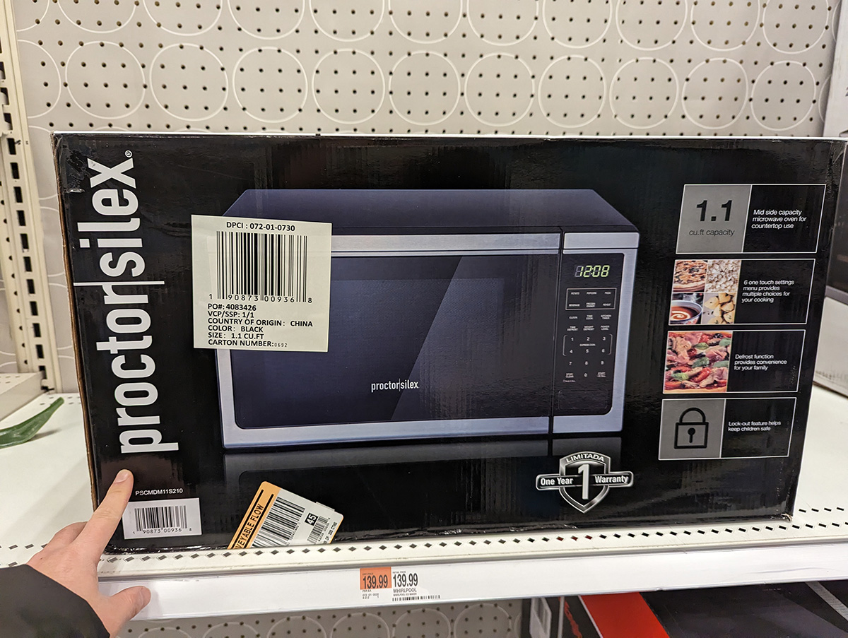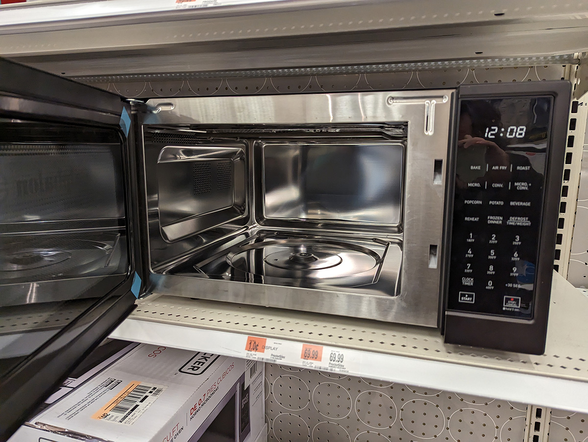 it took me a while to find the microwaves at target. i thought they didn't have any, as they weren't located with the other kitchen appliances, but rather a few aisles down. they had more than best buy, but even here the selection was much to be desired. they had a bunch of proctor silex models in boxes, but none on display. there was a panasonic with inverter technology; i think inverters are cool, but panasonic doesn't have one-touch express cook like on many other models. there was a black+decker model that seemed like a reasonable size. i couldn't tell how big it was as it missing its label and there weren't any boxed models either. i figured maybe it was 1 cu.ft. or larger. the thing i liked most is the handle. it's a lot easier to use compared to an open button. there was a smaller black+decker model - 0.7 cu.ft. at $80, it too featured a handle, but too small for what i was looking for. there was a calphalon model - also with a handle - along with stainless steel interior. at 1.3 cu.ft. it can only only microwave, but air fry and convection cook as well. it's too big for what i need, and i don't trust microwaves that also air fry (which seems to be a thing now), something taboo about putting metal objects inside of a microwave oven. those were basically the available floor models. i bought some aussie miracle curls shampoo and conditioner before leaving.
