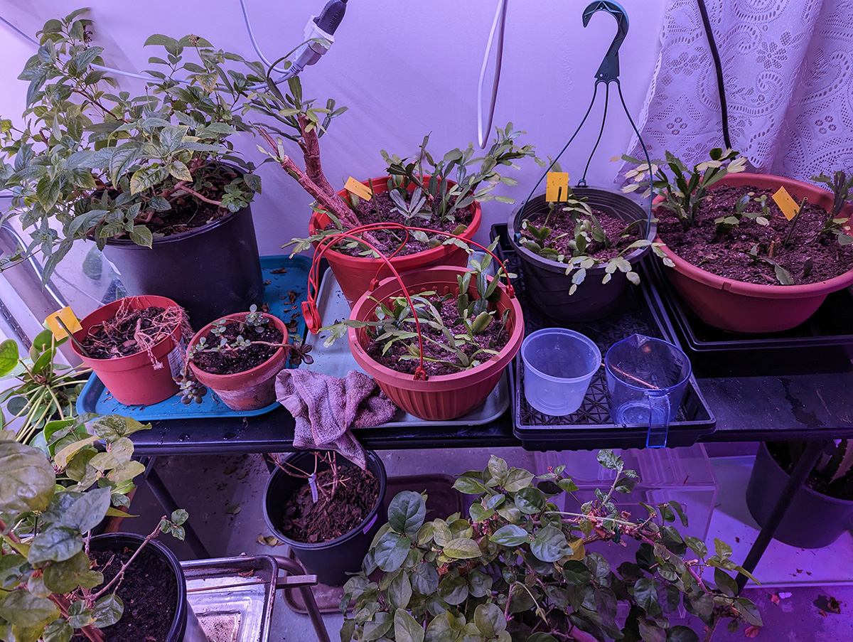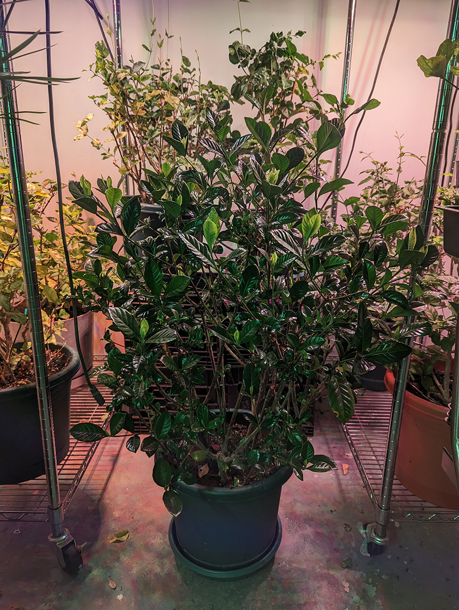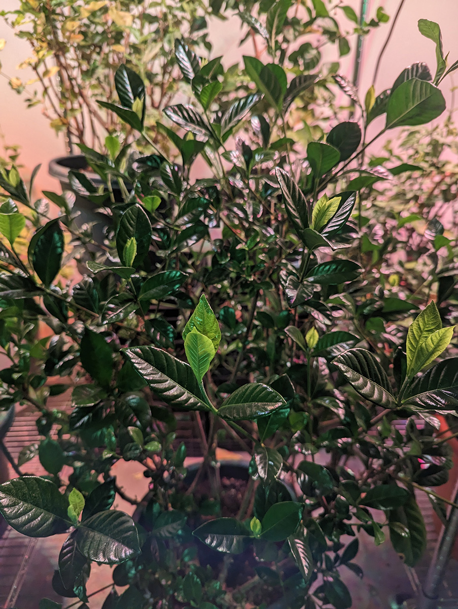 around 4pm i went down to the grow room to water the plants. most of the plants i could've probably waited another week to water, but many of the pileas were bone dry with their tiny pots. it's pretty evident that pileas growing in bigger pots are healthier, while the small potted ones are all drooping. i examined the gardenia, and i'm certain that the newly emerged leaf buds are in fact future flower buds. seems like every terminal bud is forming into a flower bud. we may just get some flowers this season.
