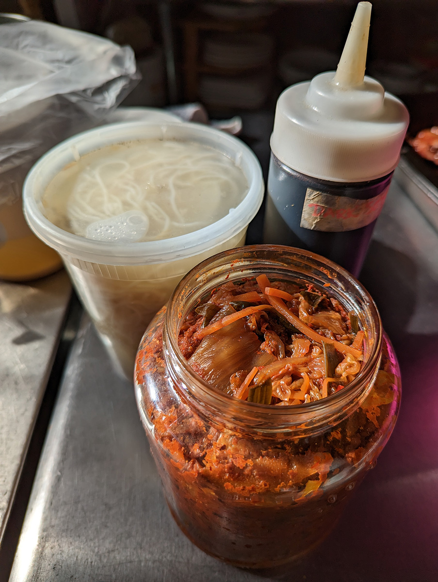 my mother fished out two old jars of korean kimchi from the cafe refrigerator. i'm not sure how old they are, a few years at least. they'd never been opened, and the kimchi inside looked fine despite some mold and rust on the lid. here's the thing: aged kimchi is a thing. this info was relayed to me by genuine koreans when i worked in china (not korean-americans). they told me they've eaten kimchi that's 10+ years old, and the older the better. so i opened one of the kimchi jars. there was no mold inside, which is a good sign. it had a very pungent kimchi smell, also a good sign. i taste tested some. the vegetable was mushy, with none of its original crunch. i wouldn't eat it as-is, but the kimchi has basically reduced into a sauce, and i would definitely use it for cooking purposes.