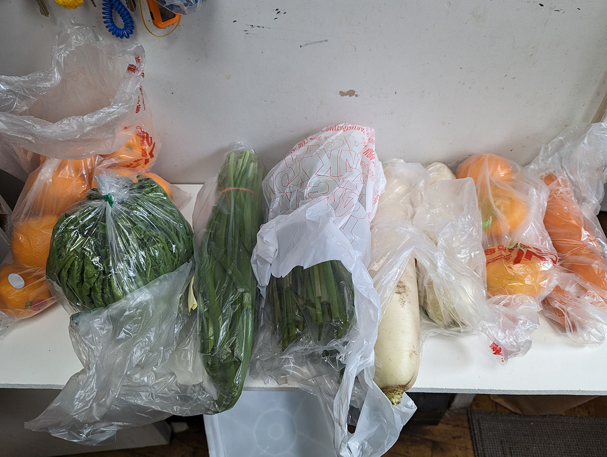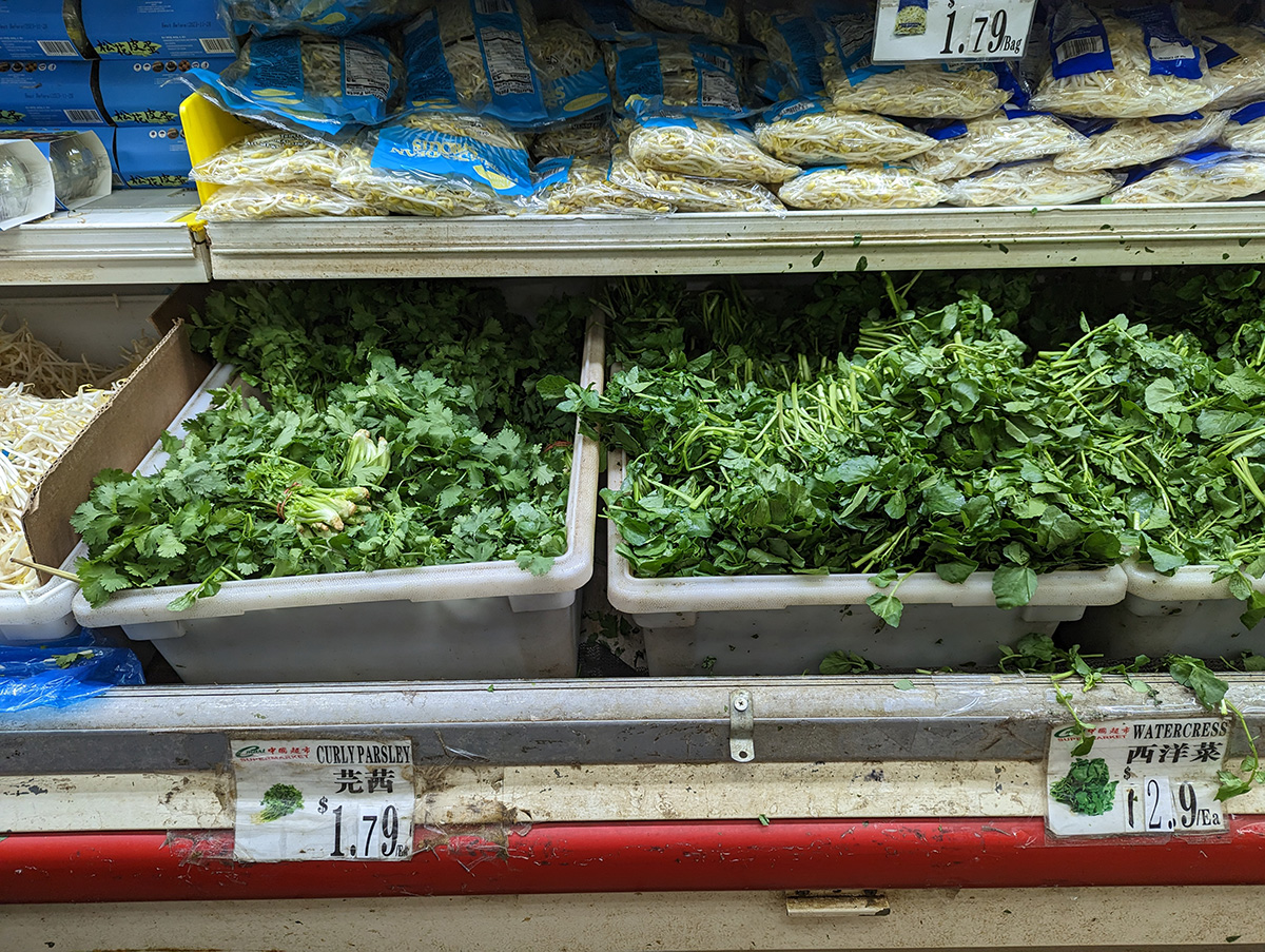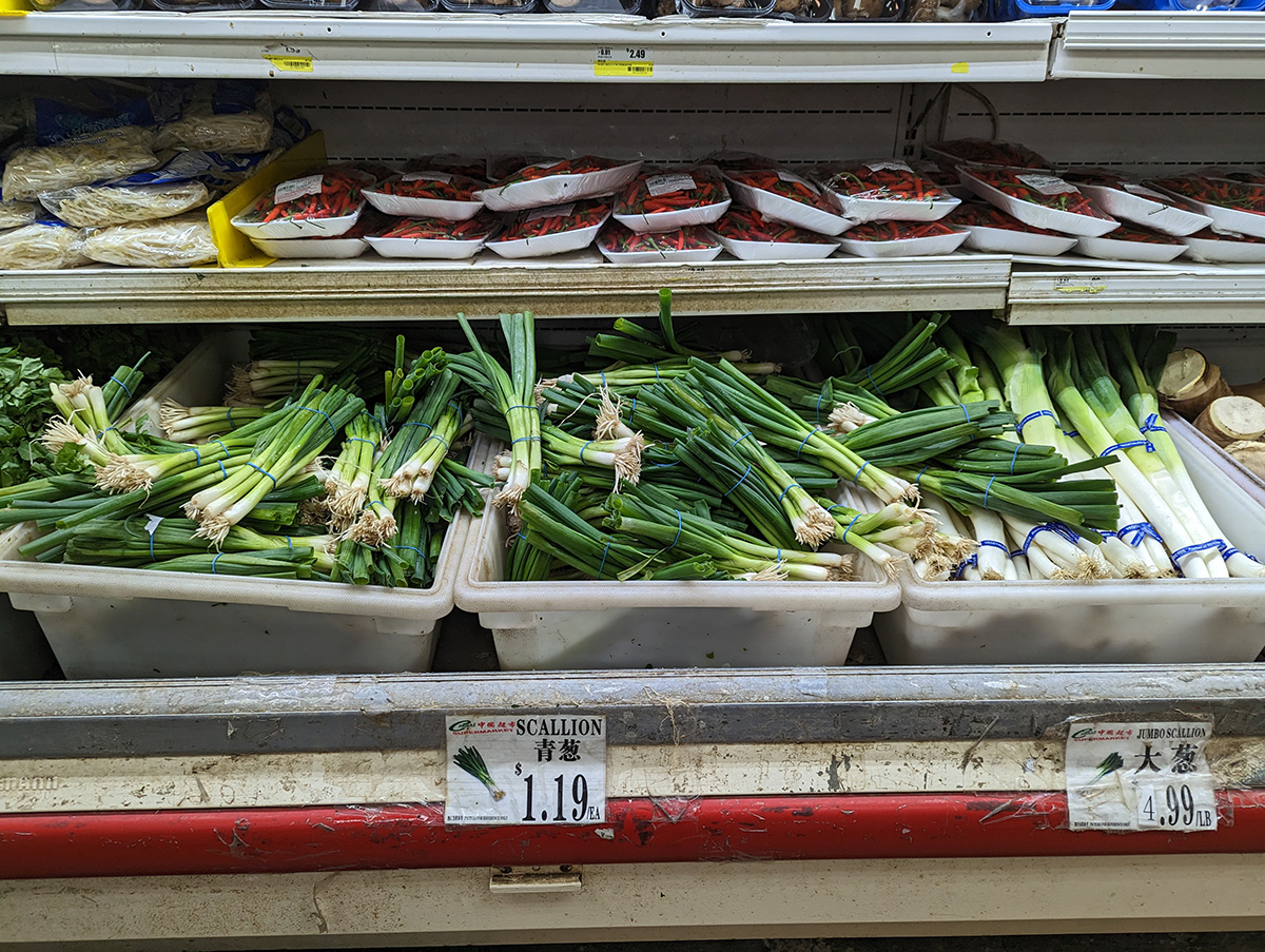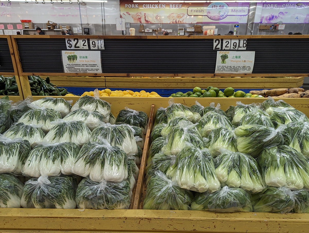 i went to c-mart first, to pick up some watermelon seeds, some 5-spice tofu squares, and some oranges. they had the sweet oranges i've bought a bunch of times before (6 for $2), as well as israeli orri oranges ($3/lbs, i got 3 just to try). i made a mental note of some vegetable prices, so i could do a bit of comparison shopping. i then went to ming's market to pick up the bulk of my produce purchases, including vegetables i needed for my cabbage kimchi recipe (daikon, carrot, garlic chives). i got some mustard green for my mother, as well as cilantro. for some reason their prices on shanghai bokchoi was higher ($2.49/lbs), so after paying for the rest of my purchases, i went back to c-mart to buy bokchoi from there ($1.79/lbs).