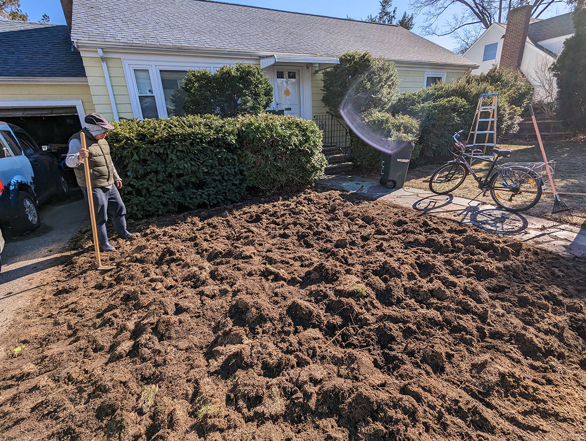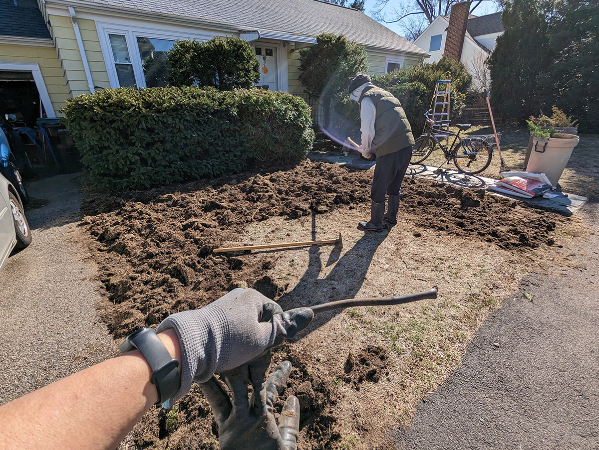 both my father and i used hoes to dig up the thick layer of dead grass. my father focused on the corner where there used to be exposed tree roots from the large maple tree that grew from the sidewalk before it got diseased and the town chopped it down. the tree roots made the lawn uneven, and was impossible to mow without scalping the lawn. he dug up as much dead roots as possible. i was using the hoe with the larger head, but the handle broke a few years back, so it was shorter, forcing me to hoe in an uncomfortable hunched over position.