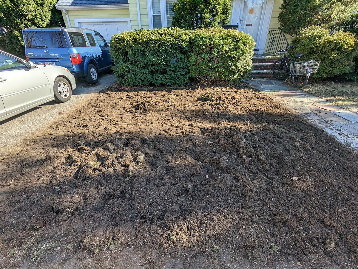 pruning was only half the job; the harder half (at least in terms of physical exertion) was digging up the lawn. it's the square patch in front of the living room window, measuring about 10x10ft. it suffered the most during last summer's drought, and by the time we decided to water it on a timer, it was already too late, most of the grass had died, leaving a thick layer of thatch that subsequent reseeding in the fall could no longer revive. so we decided last year that come spring, we'd dig up that section of lawn and start over.