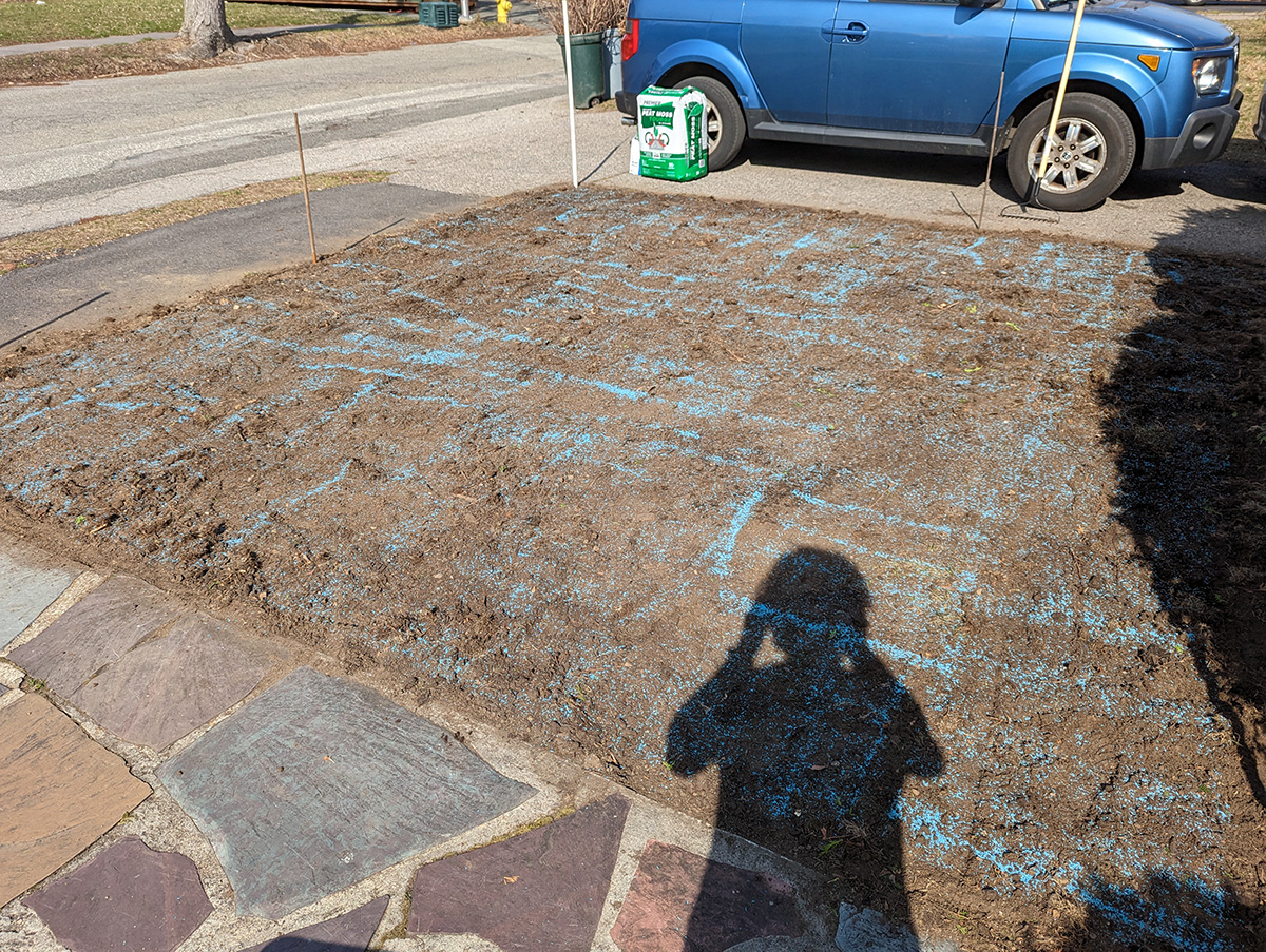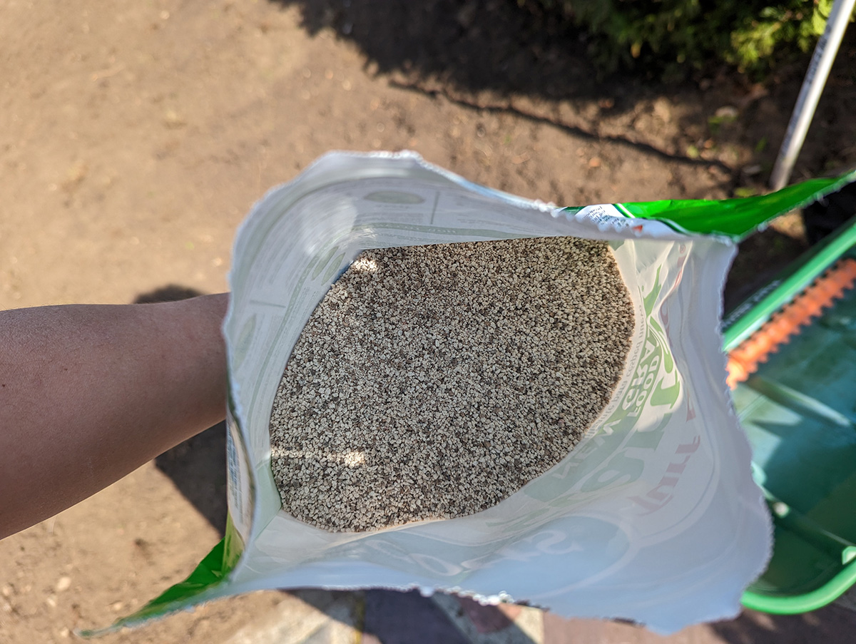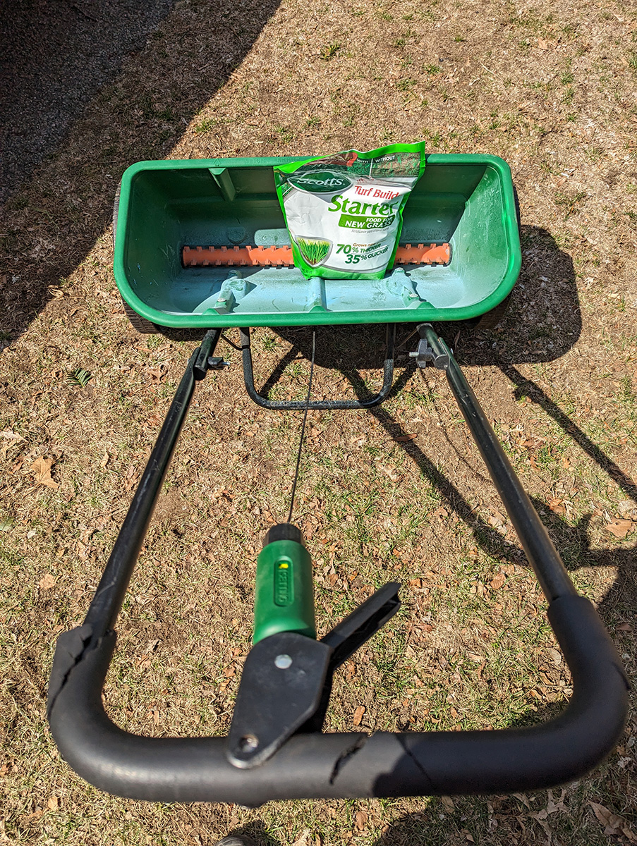 with the hose, timer, and faucet all set up, it was finally time to reseed the lawn. i first started with the fertilizer, specialized for new grass. instruction said to set the drop spreader to 6. after spreading, i used the rake to work the fertilizer pellets deeper into the soil. next came the grass seeds. instruction said to set the drop spreader to 17-1/2. like with the fertilizer, i used a rake afterwards to work the seeds into the soil. i also walked on the dirt to give it some compaction, leveling the growing surface. finally i added a thin layer of peat moss, just enough to cover any exposed seeds (easy since the seeds were colored blue). i wasn't planning on adding peat moss because i heard it makes the soil more acidic, which the grass doesn't like. but peat moss provides a cover for the seeds, otherwise birds might eat them, and peat moss also absorbs more water than just soil, so it keeps the seeds (and eventual seedlings) moist.