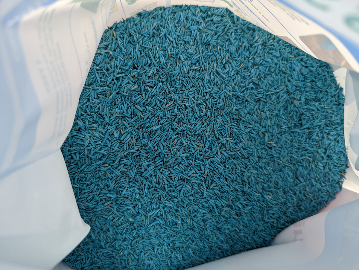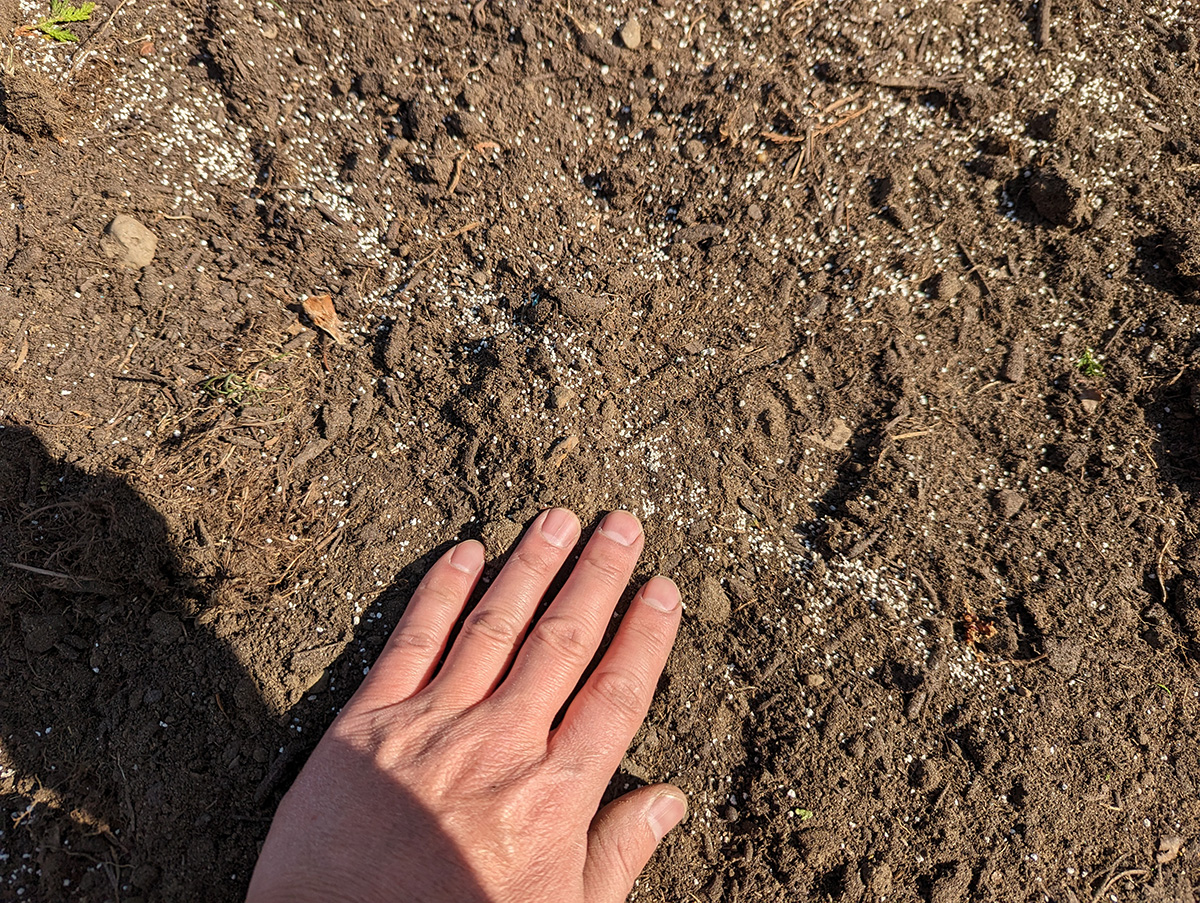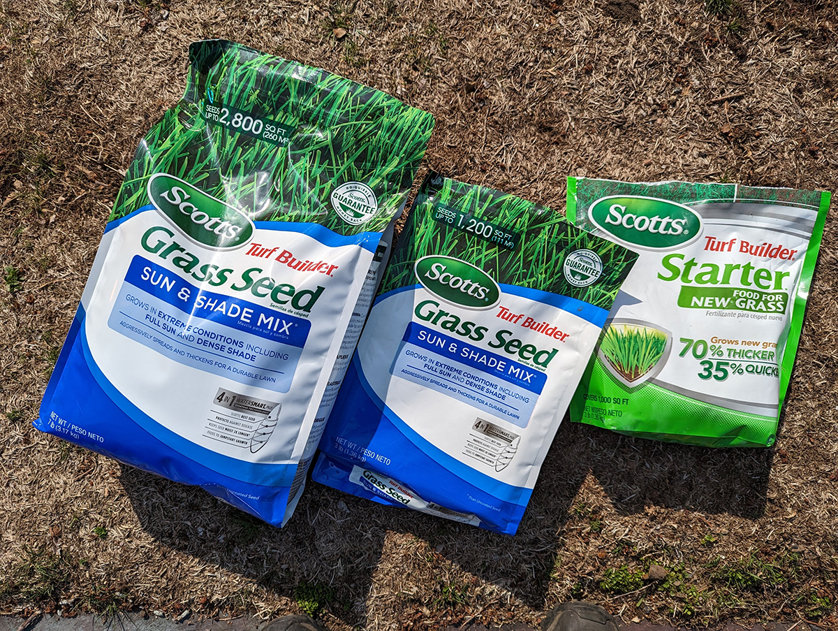 with the hose, timer, and faucet all set up, it was finally time to reseed the lawn. i first started with the fertilizer, specialized for new grass. instruction said to set the drop spreader to 6. after spreading, i used the rake to work the fertilizer pellets deeper into the soil. next came the grass seeds. instruction said to set the drop spreader to 17-1/2. like with the fertilizer, i used a rake afterwards to work the seeds into the soil. i also walked on the dirt to give it some compaction, leveling the growing surface. finally i added a thin layer of peat moss, just enough to cover any exposed seeds (easy since the seeds were colored blue). i wasn't planning on adding peat moss because i heard it makes the soil more acidic, which the grass doesn't like. but peat moss provides a cover for the seeds, otherwise birds might eat them, and peat moss also absorbs more water than just soil, so it keeps the seeds (and eventual seedlings) moist.
