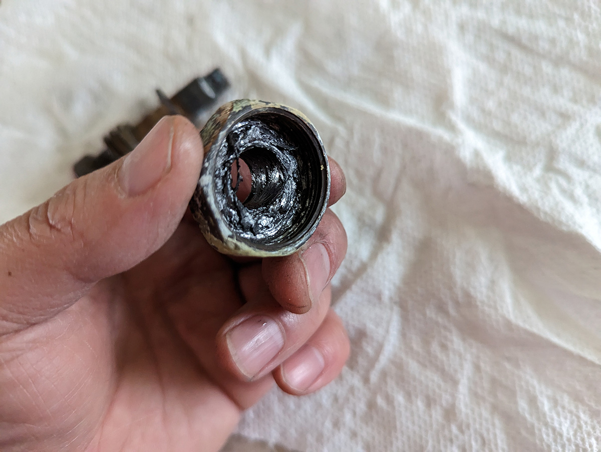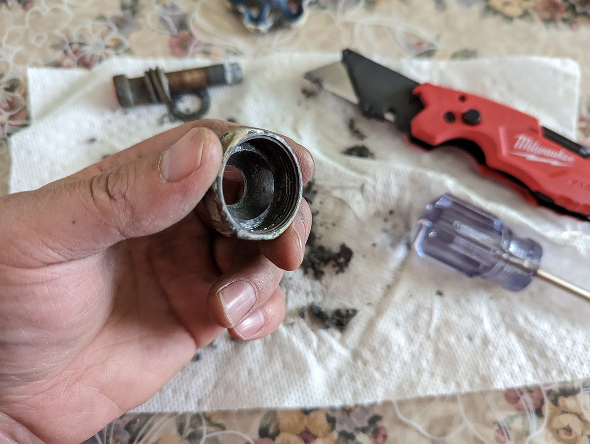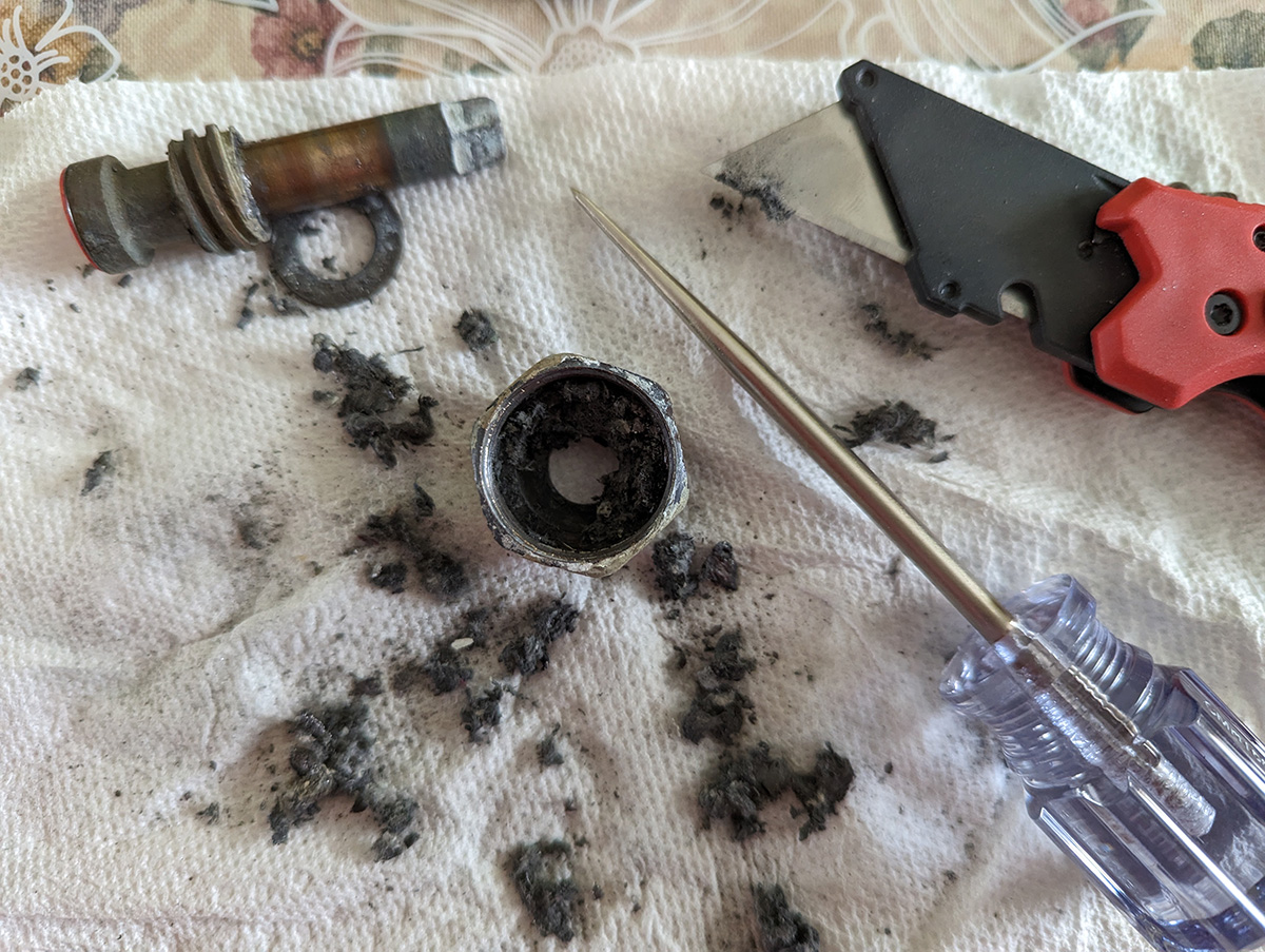 so i took it off again and then went inside to remove all the old packing. not sure the age of this faucet head, but the packing wasn't even graphite, more like highly compressed cardboard. using a utility knife and an awl, i finally managed to empty the bonnet. i reused the graphite packing i used earlier, then put the whole assembly back on the front faucet. it was now leaking even more than before, and no amount of clockwise tightening could make it stop leaking.