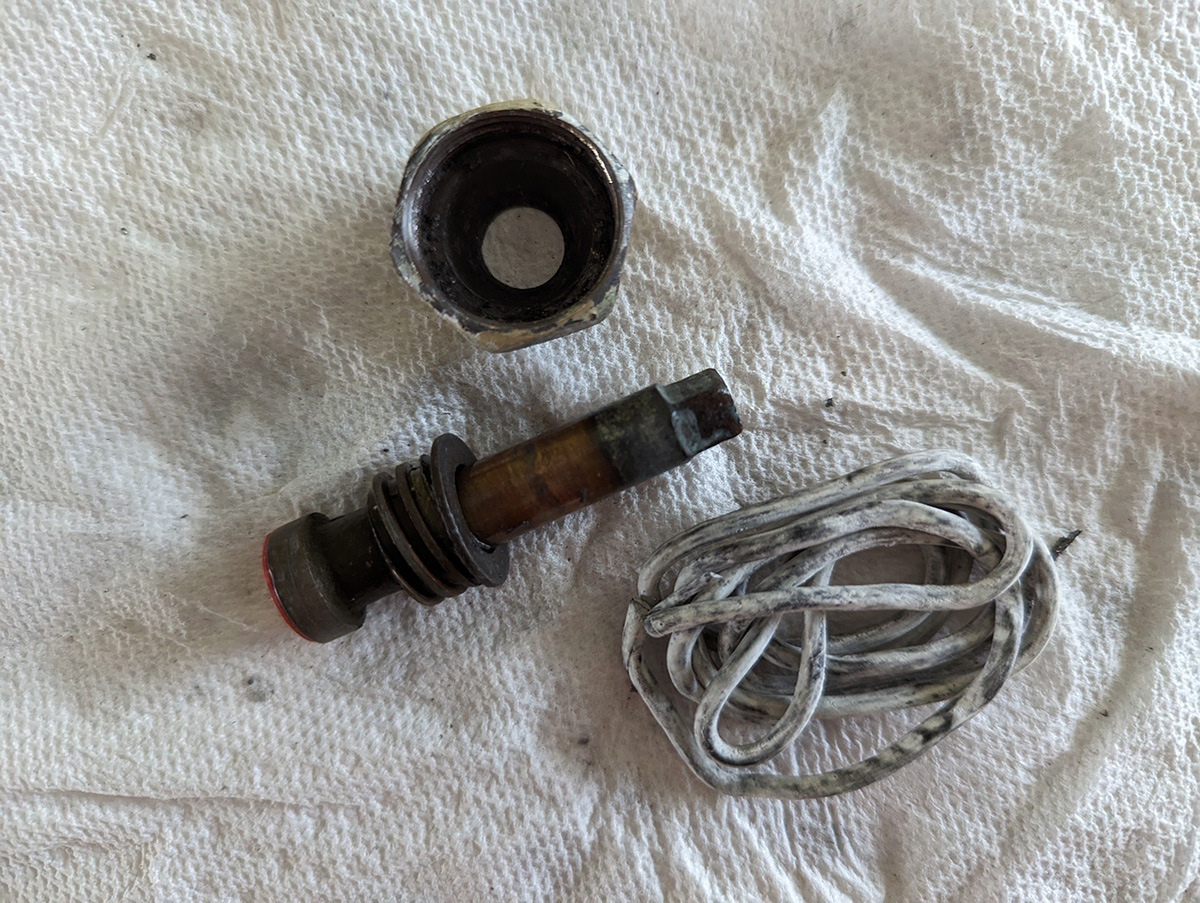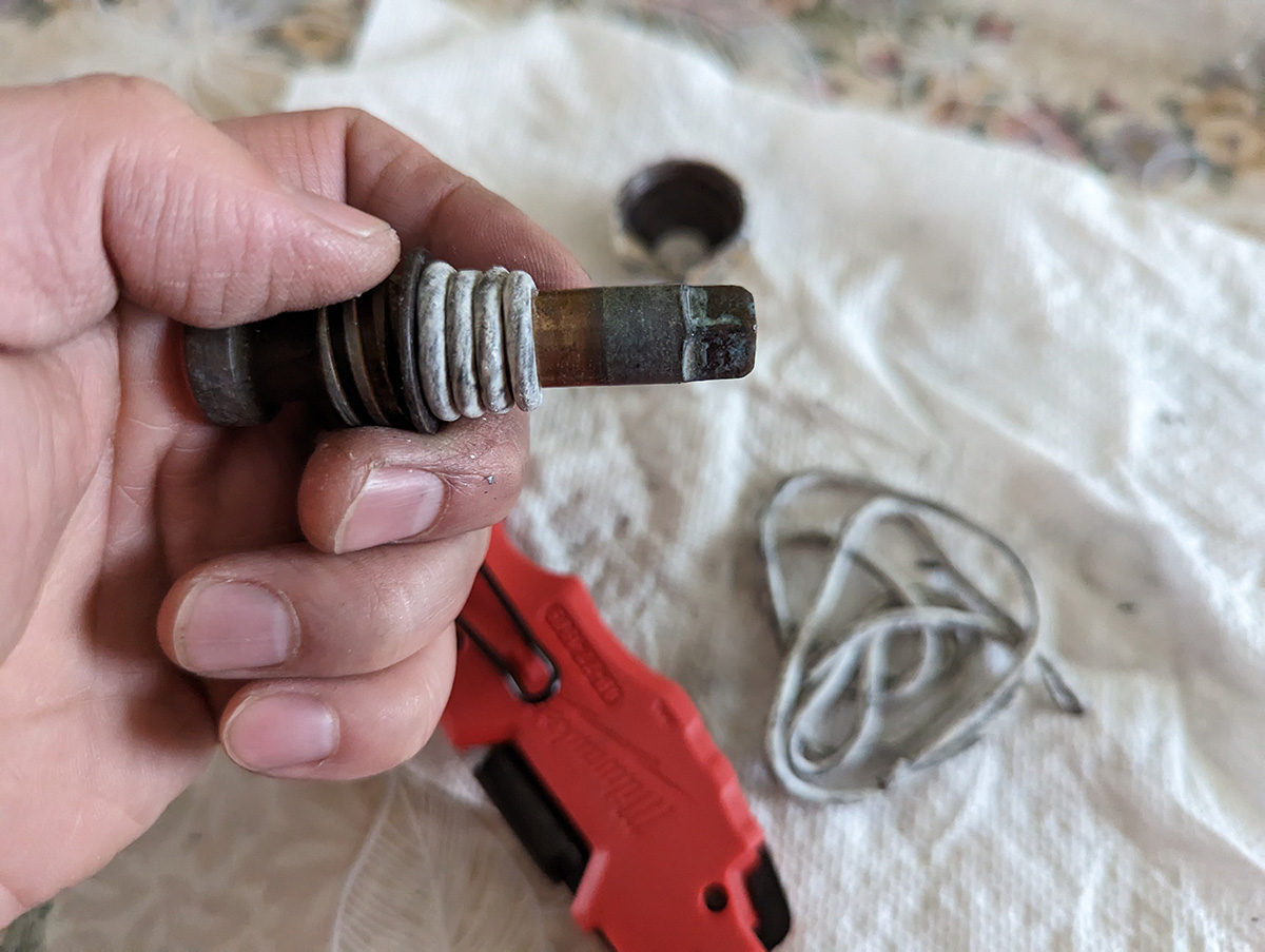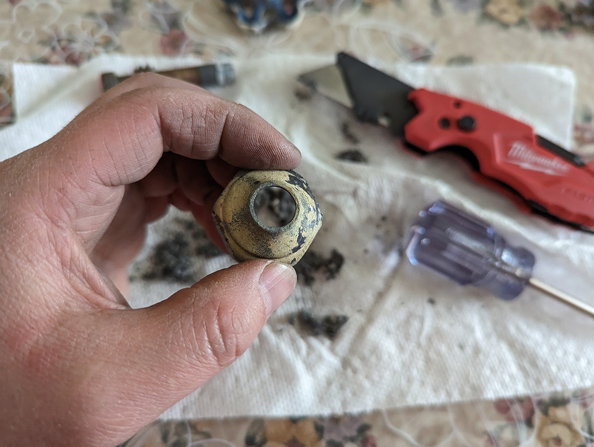 so i took it off again and then went inside to remove all the old packing. not sure the age of this faucet head, but the packing wasn't even graphite, more like highly compressed cardboard. using a utility knife and an awl, i finally managed to empty the bonnet. i reused the graphite packing i used earlier, then put the whole assembly back on the front faucet. it was now leaking even more than before, and no amount of clockwise tightening could make it stop leaking.