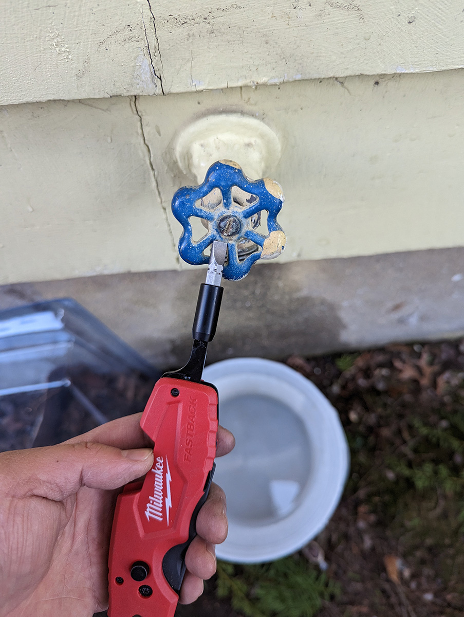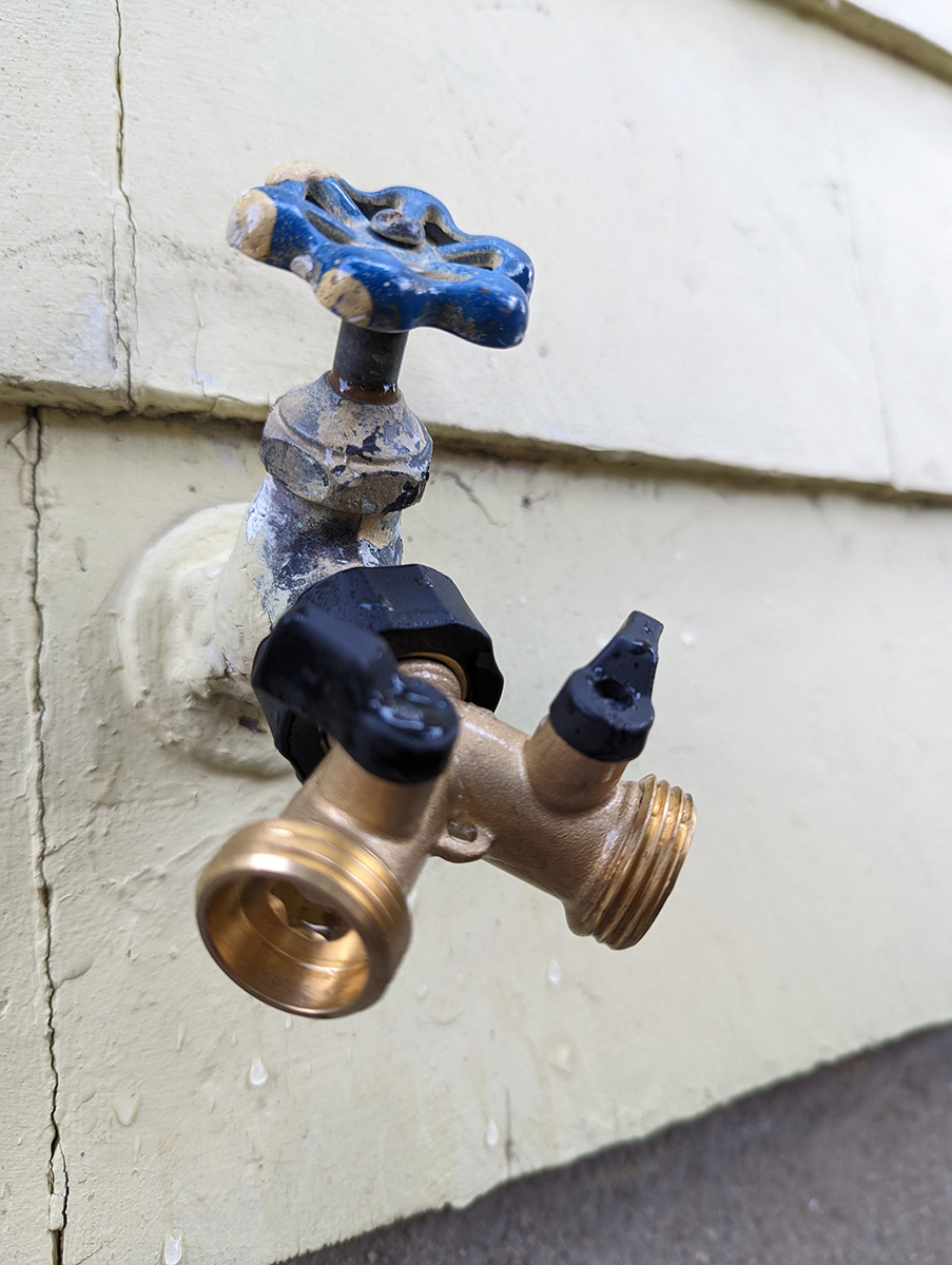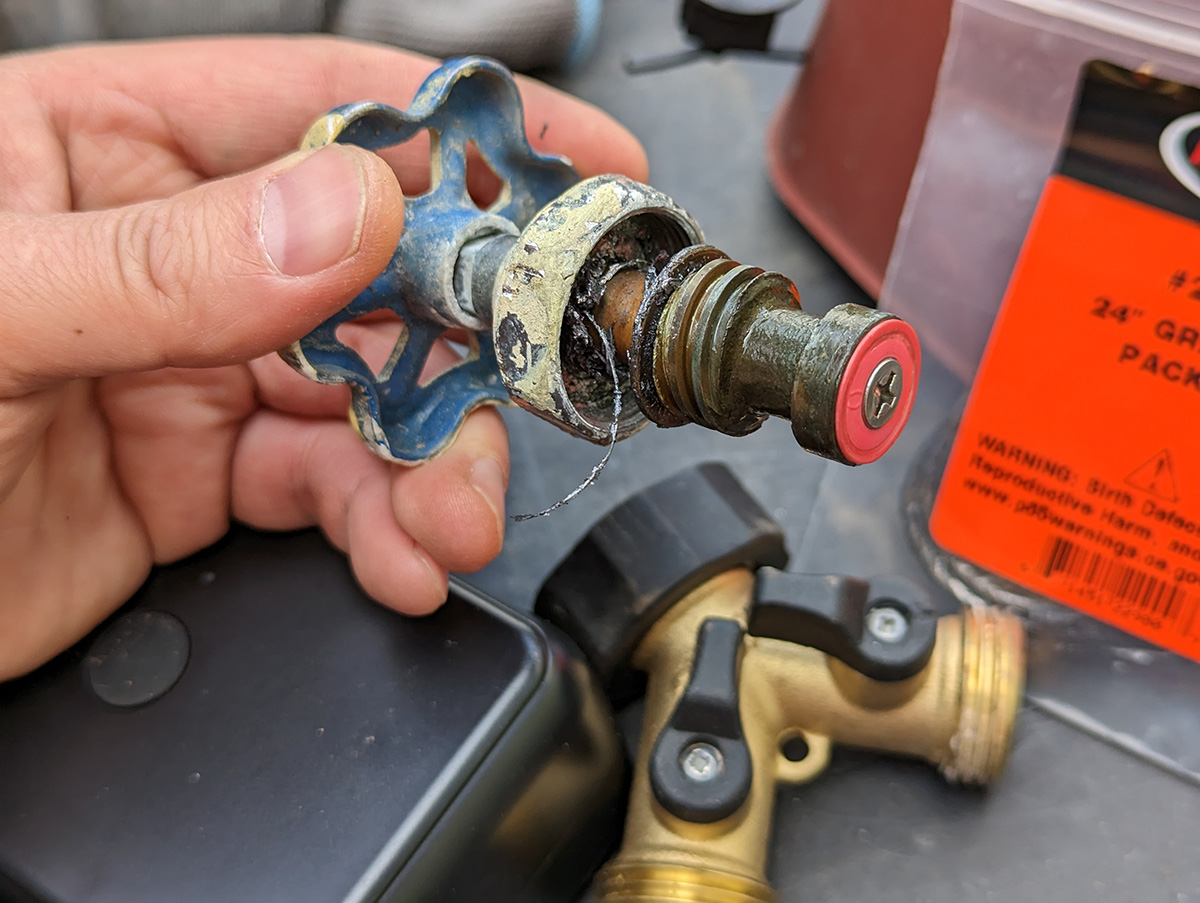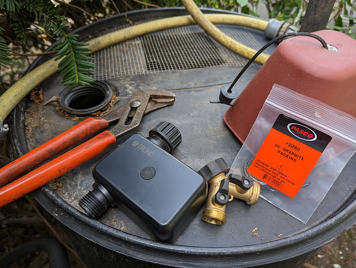the big project was reseeding the square of front lawn. for that to work, i needed to set up the wifi-controlled TROND smart sprinkler timer with the front faucet. but the front faucet leaks when turned on, and when i tried to fix it last year with some graphite packing, it wasn't enough so still continued to leak. i removed the bonnet with a pair of channel lock pliers and added some new graphite packing. i added too much because i couldn't reattach the bonnet.