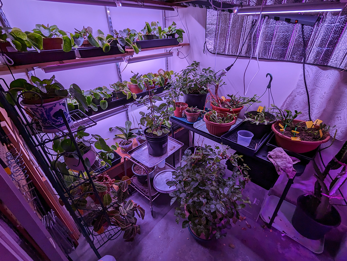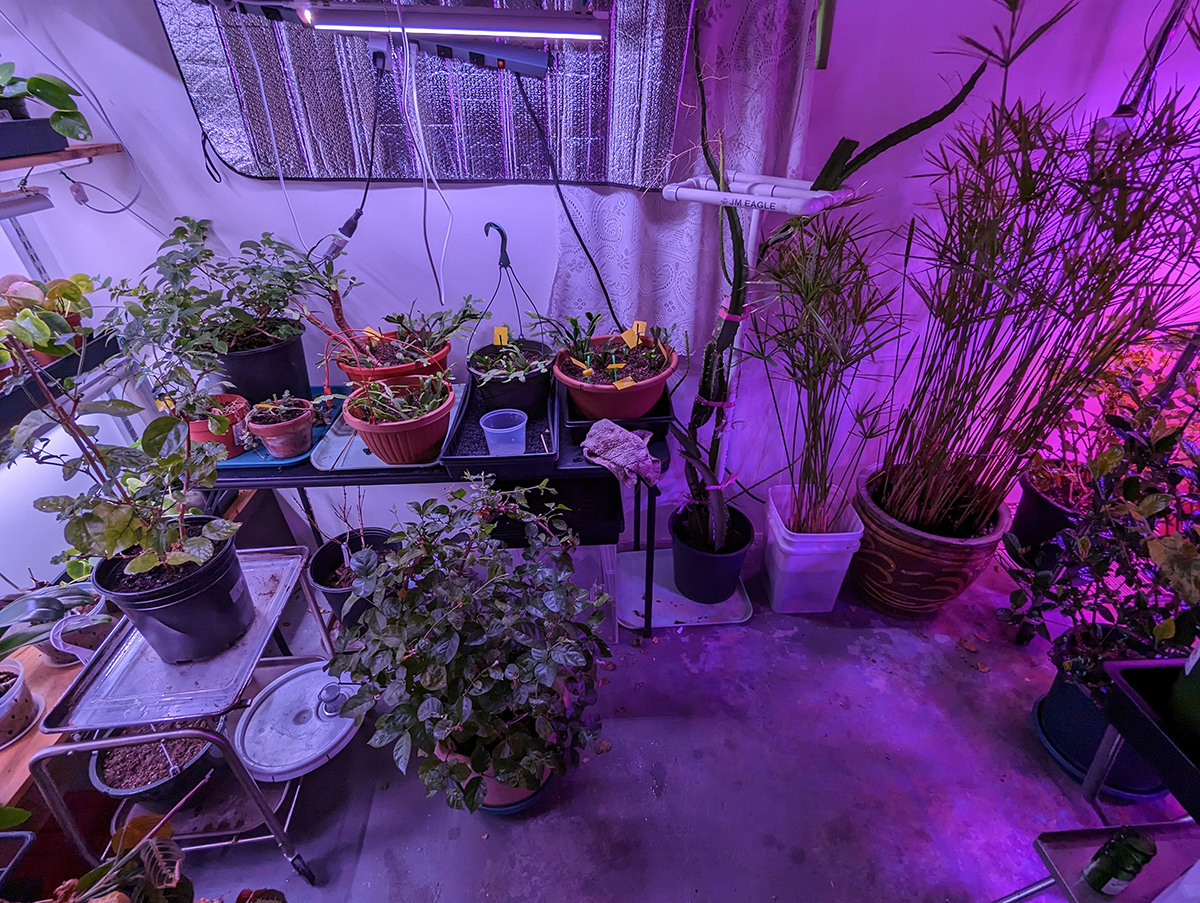 today was a really nice day, temperature was 59°F but felt much warmer. i wore a t-shirt for most of the day, and only felt a little chilly in the late afternoon, once the sun was lower on the horizon. first thing i did when i got to belmont was move out all the jasmines and gardenia from the basement and out into the backyard, so they could get some real sunshine and i could inspect them for mealybugs and spray with neem oil. i also watered the remaining plants still in the grow room, the pileas, the prayer plants, the orchids. i added some acid-loving fertilizer to the remaining water, so i could water the jasmines and gardenia later.