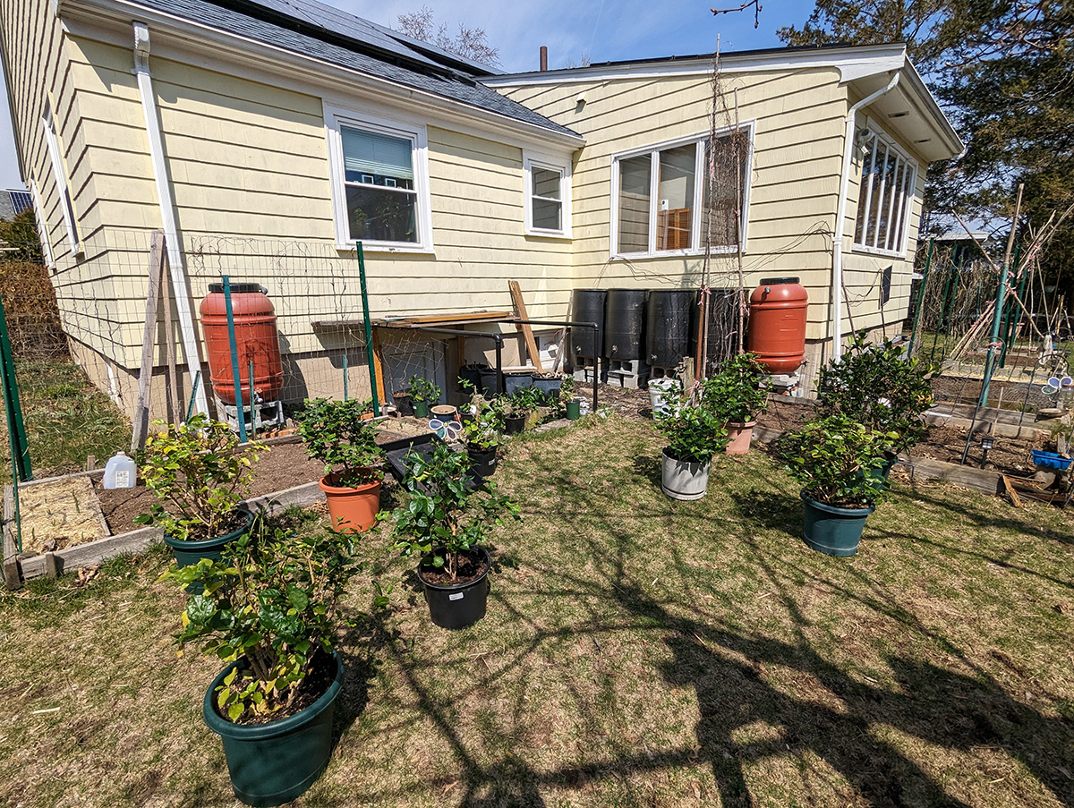 since i was in the backyard, i put back the cinder block bases and put back the 5 rain barrels along the sunroom. none of them are connected yet, hopefully we'll get everything attached this weekend so we can start collecting rain. i also bought out all the garden refuse bins, as belmont will begin pick them up starting this week.