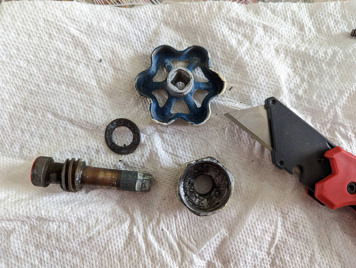so back inside with the bonnet, i removed the graphite packing and put in new packing. this time i went online and got some instructions: 3 counterclockwise winding on the stem. the new graphite packing i was using i bought on amazon, and instead of brittle graphite yarn, it was more like a string of soft clay with what i assume is graphite inside. i put the bonnet assembly back onto the faucet, this time it worked much better. there was still a little bit of moisture on the stem, but i didn't actually witness any leaks, so i could live with this.