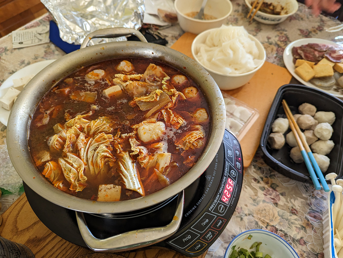 for dinner we had more hot pot, but only the broth (which is so oily you can't eat it) and some stray floating tofu or meatball or cabbage. my mother made a water spinach stirfry and a tofu hot pepper stirfry. i finally left by 8pm.