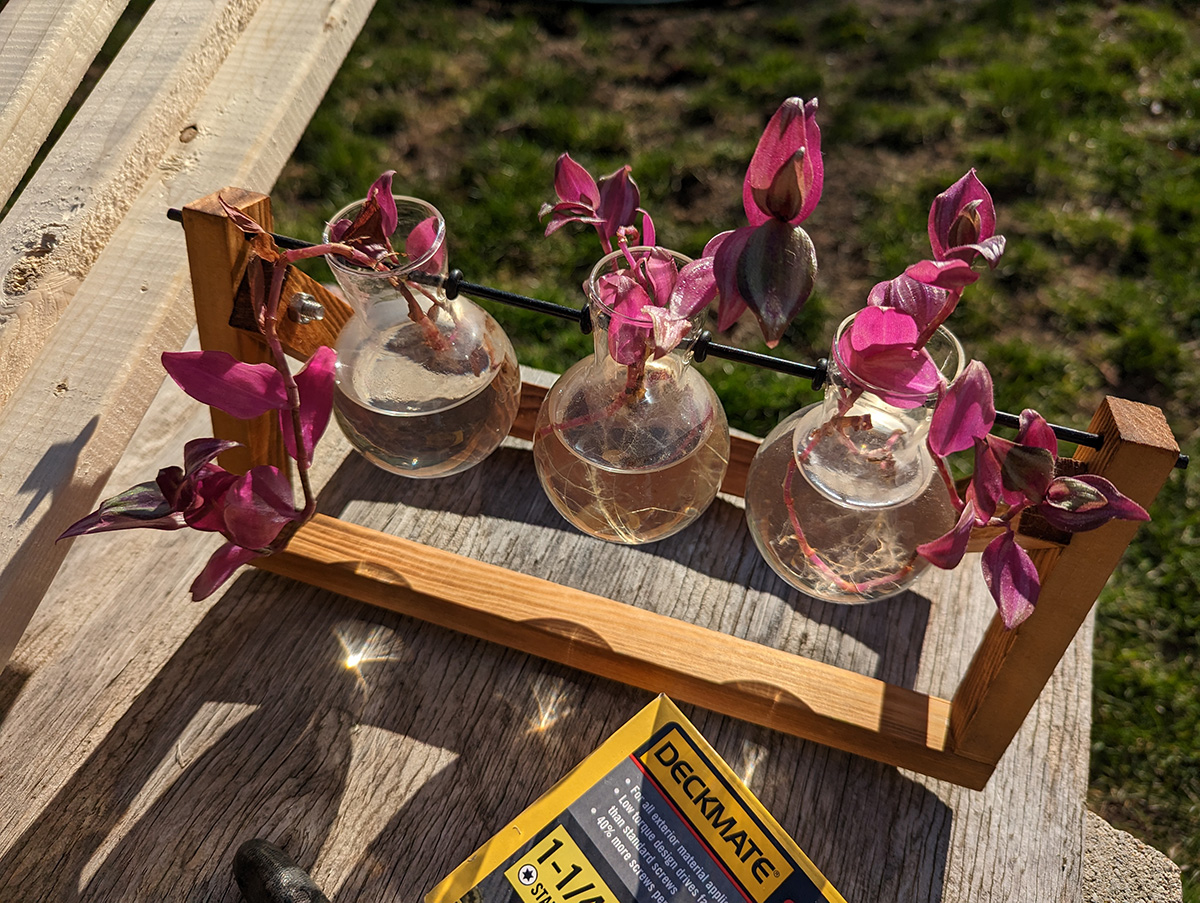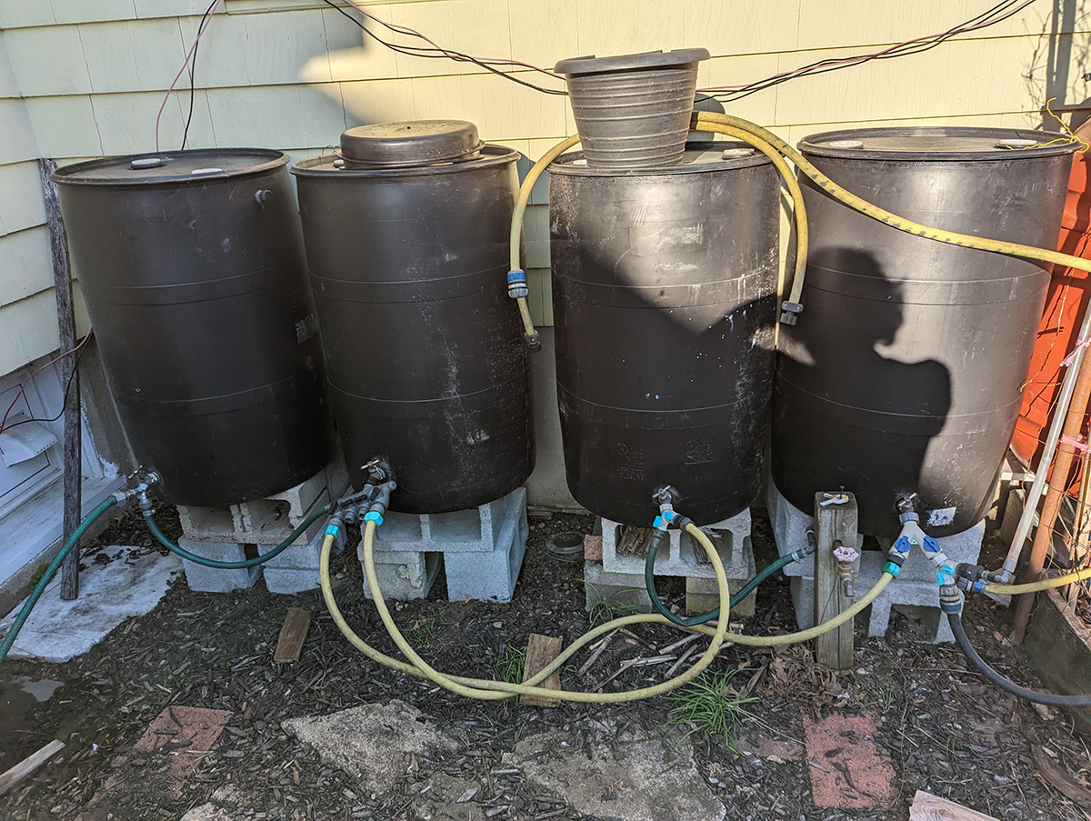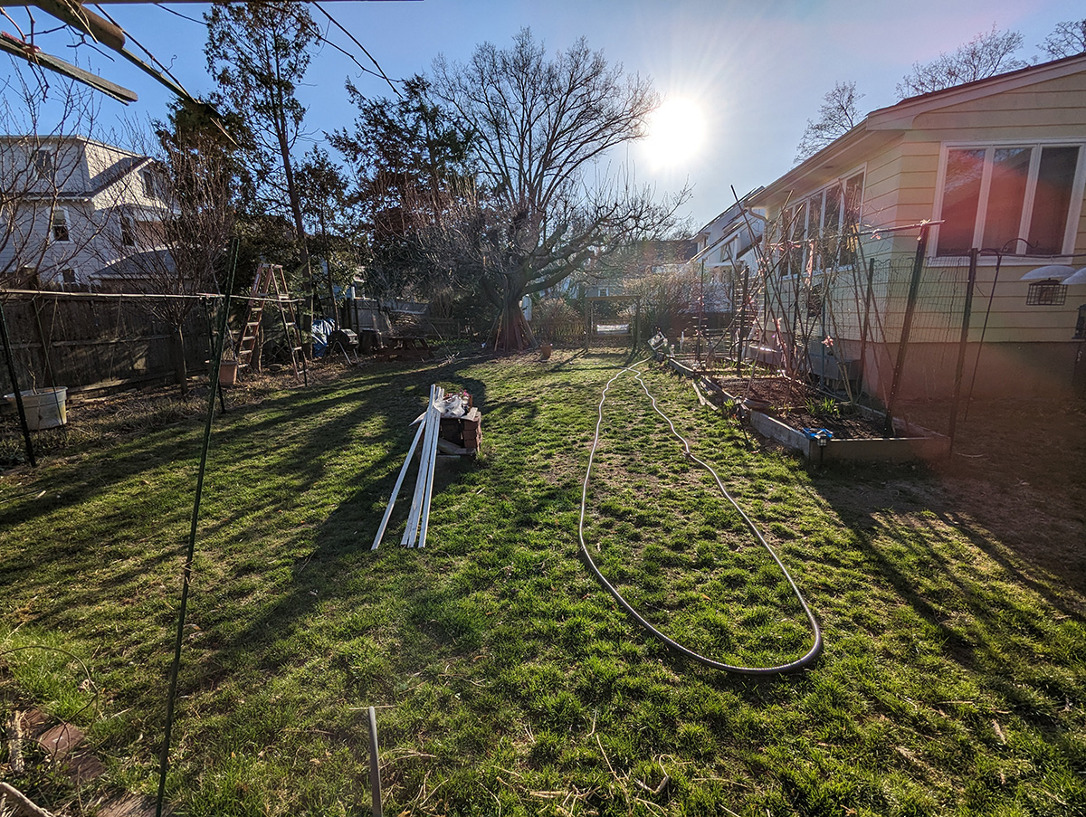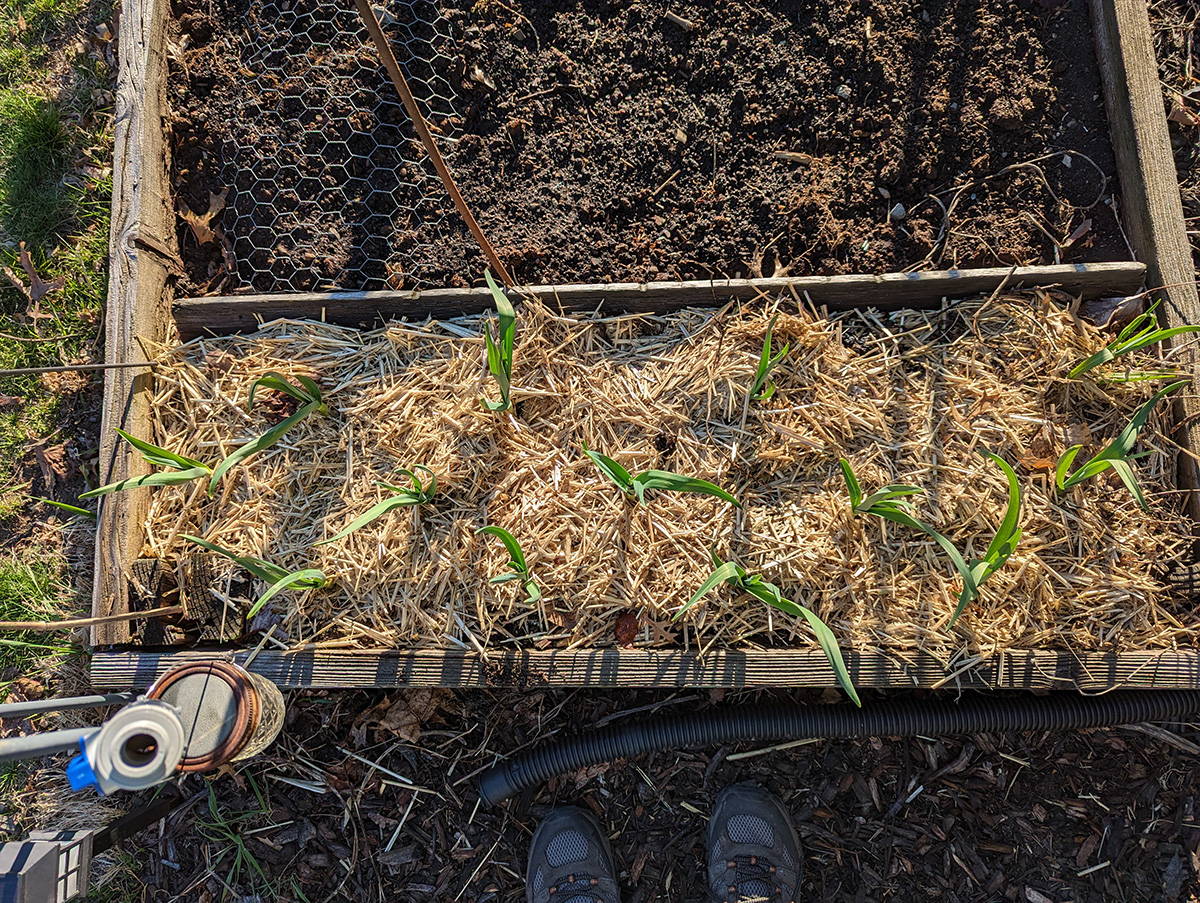 while my father was busy reconnecting all the rain barrels, i was filling the garden hose with water so they can soften and get rid of their kinks in the sun. i also took the opportunity to water the raised beds, i've yet to water them since planting all those seeds last tuesday. i added some bone meal to the garlic beds, helps them to grow bigger bulbs. i took some leftover window screens and replaced two of the screens on the front yard rain barrels. i recaulked a rain barrel that was leaking last season with some leftover clear silicone caulk i found in the garage (means i can return the tube that i bought). i was going to plant the spiderworts that've been soaking in water all winter, but ran out of time. looks like i need to come back tomorrow to do more gardening stuff, plus i didn't get a chance to water the grow room plants.